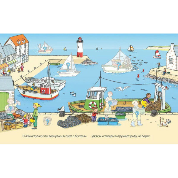 Книжка отличная, как впрочем и все остальные книги этой серии! Правда мальчика в 2,5 года она заинтересовала не так сильно, как, например, "На стройке", "Транспорт" или "Пожарные и спасатели", не любитель он рыбок :) Но развороты с кораблями в море и рыболовными судами с рыбным рынком с интересом рассматривает до сих пор. Указаны места, куда нужно наклеить наклейку, ребенок с интересом ищет их на страницах. Само качество книги очень хорошее: наклейки и страницы плотные, обложка гладкая. Сама книга небольшая, удобно брать с собой в дорогу, если нужно занять ребенка чем-нибудь полезным и интересным. В общем, для пополнения коллекции из книг этой серии стоит приобрести!