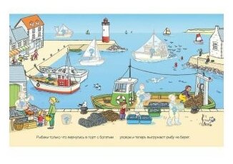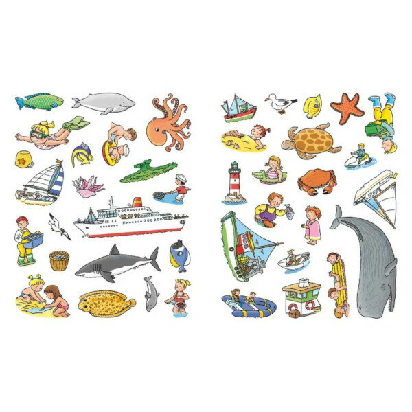 Очень любим книжки из этой серии. После поездки на море с сыном решила приобрести и данную книжку, чтобы не забывал основные моменты, связанные с морем. Поскольку наклейки одноразовые, заполнить книжку, в которой пять разворотов, не представляет особого труда и времени для двухлетки. Но наклеив все наклейки мы многократно возвращаемся к самим изданиям из данной серии, уж больно они детализированные и хороши. Эта книжка не исключение. Детали на сюжетных картинках продуманы до мелочей. Разворот на берегу расскажет, чем занимаются детки с родителями на пляже; в порту есть и маяк и рыбный базар и моряки с угловом и даже кошки, пытающиеся втянуть рыбку; в море представлены разнообразные судна; подводный мир и его крупные обитатели, а также мелкие рыбки занимают два последних разворота.