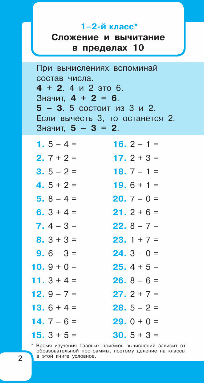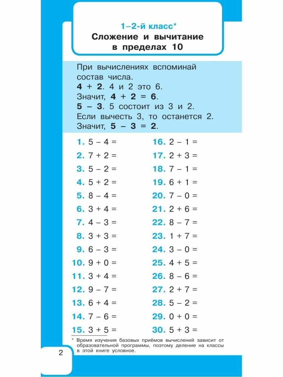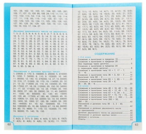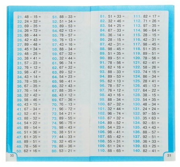 Небольшого размера книжечка. Для ребёнка очень удобно брать с собой в школу, решать примеры на переменах. Понравилось, что в начале каждой темы прописано правило с примером как разложить цифры чтобы быстрее посчитать в уме.