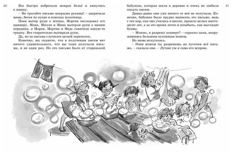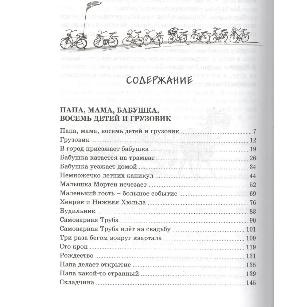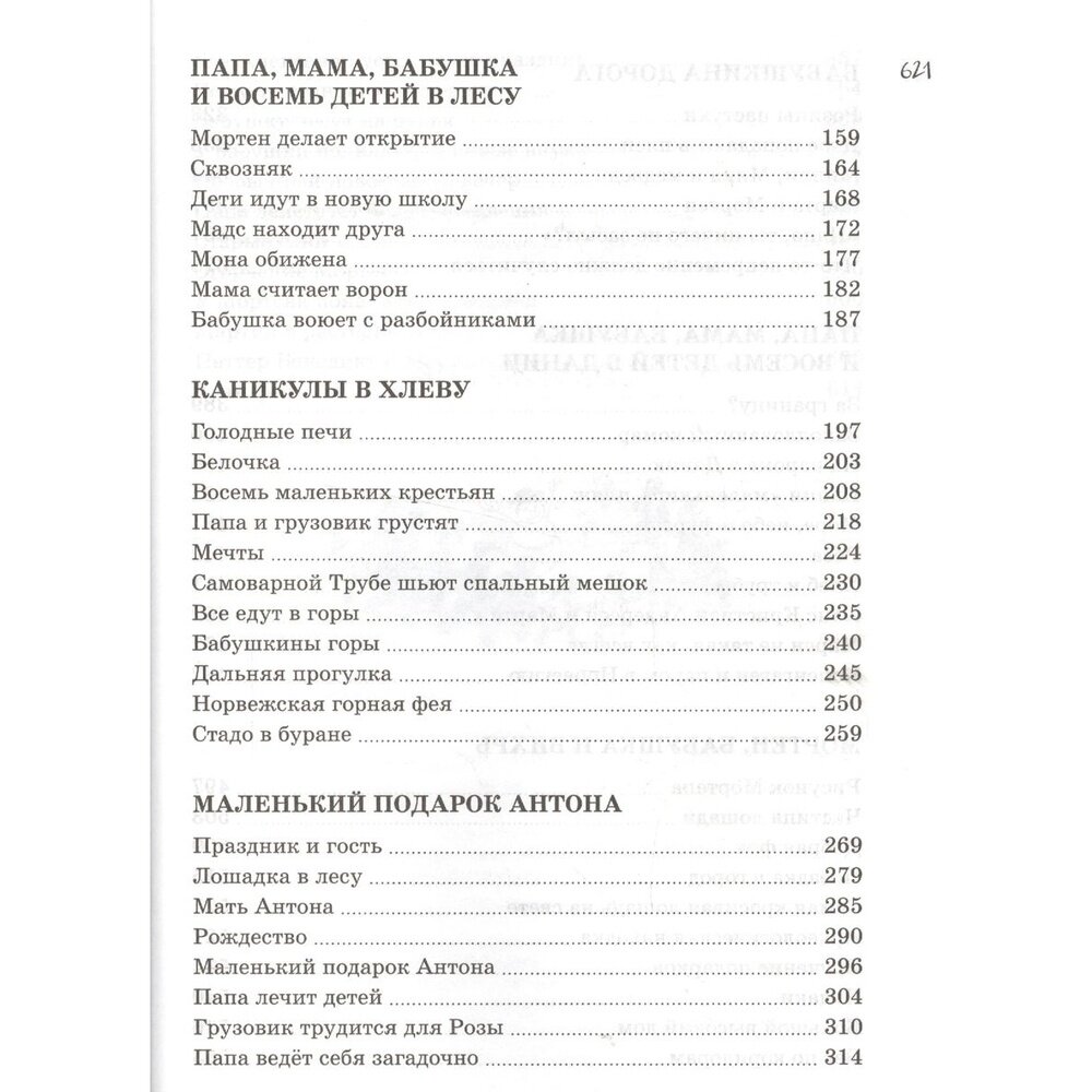 В книгу входят 7 повестей: 《Папа, мама, бабушка, восемь детей и грузовик》, 《Папа, мама, бабушка и восемь детей в лесу》, 《Каникулы в хлеву》, 《Маленький подарок Антона》, 《Бабушкина дорога》, 《Папа, мама, бабушка и восемь детей в Дании》, 《Мортен, бабушка и Вихрь》. Иллюстрации черно-белые. На моей памяти это наиболее полный сборник повестей про семью. Книга стоящая, про настоящие любящие отношения, про заботу друг о друге.
