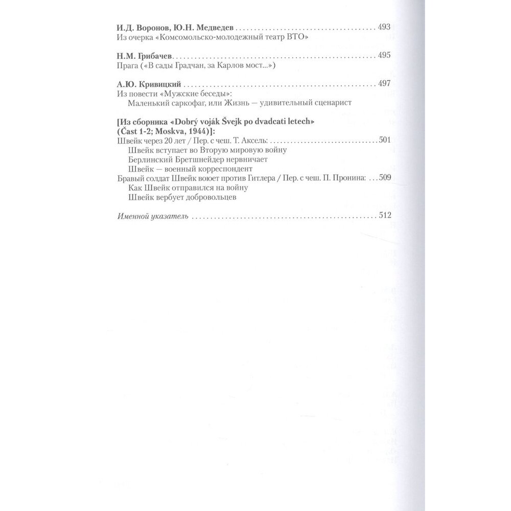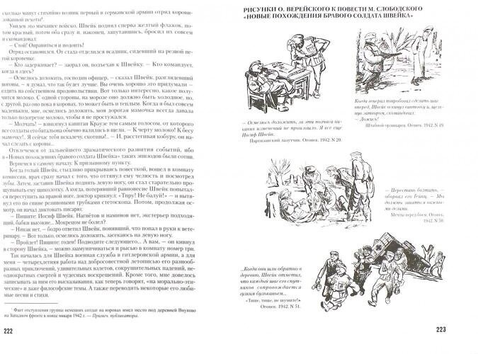 Основная тема книги - совершенно особый интерес к герою романа Я. Гашека в России в годы Великой Отечественной войны. В нее включены рассказы о Швейке, написанные литераторами и журналистами - участниками обороны Севастополя, Ленинграда и Сталинграда. Представлены как пьесы о приключениях бравого солдата, бывшие в репертуаре профессиональных и фронтовых театральных коллективов, так и сценарии кинокартин о Швейке, премьерные показы которых состоялись в 1941-1943 гг. Также в книгу вошли дневниковые записи, письма, воспоминания участников войны, сюжетные повествования, стихотворения, театральные и кинорецензии того времени. Большая часть публикуемых текстов взята из фронтовых газет, которые позднее не переиздавались, либо из фондов Российского государственного архива литературы и искусства и издается впервые. Книгу дополняют рисунки художников, иллюстрировавших в военные годы рассказы о новых похождениях Швейка, и фотографии тех лет.