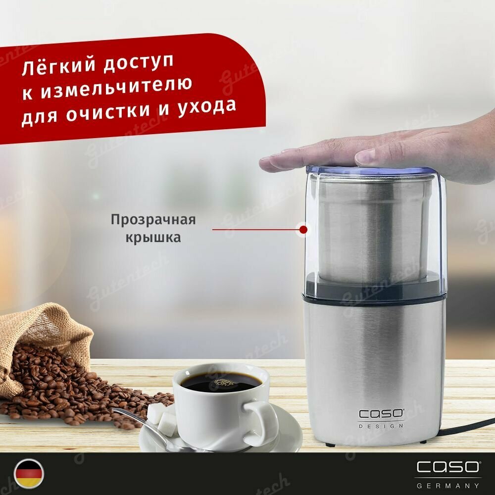 Кофемолка CASO обладает высококачественным ножом, который обеспечивает быстрое дробление и измельчение кофейных зёрен, орехов и специй. Устройство CASO характеризуется эффективным импульсным способом работы, а также наличием дополнительной защитной функции, которая обеспечивает блокировку включения оборудования при открытой крышке.