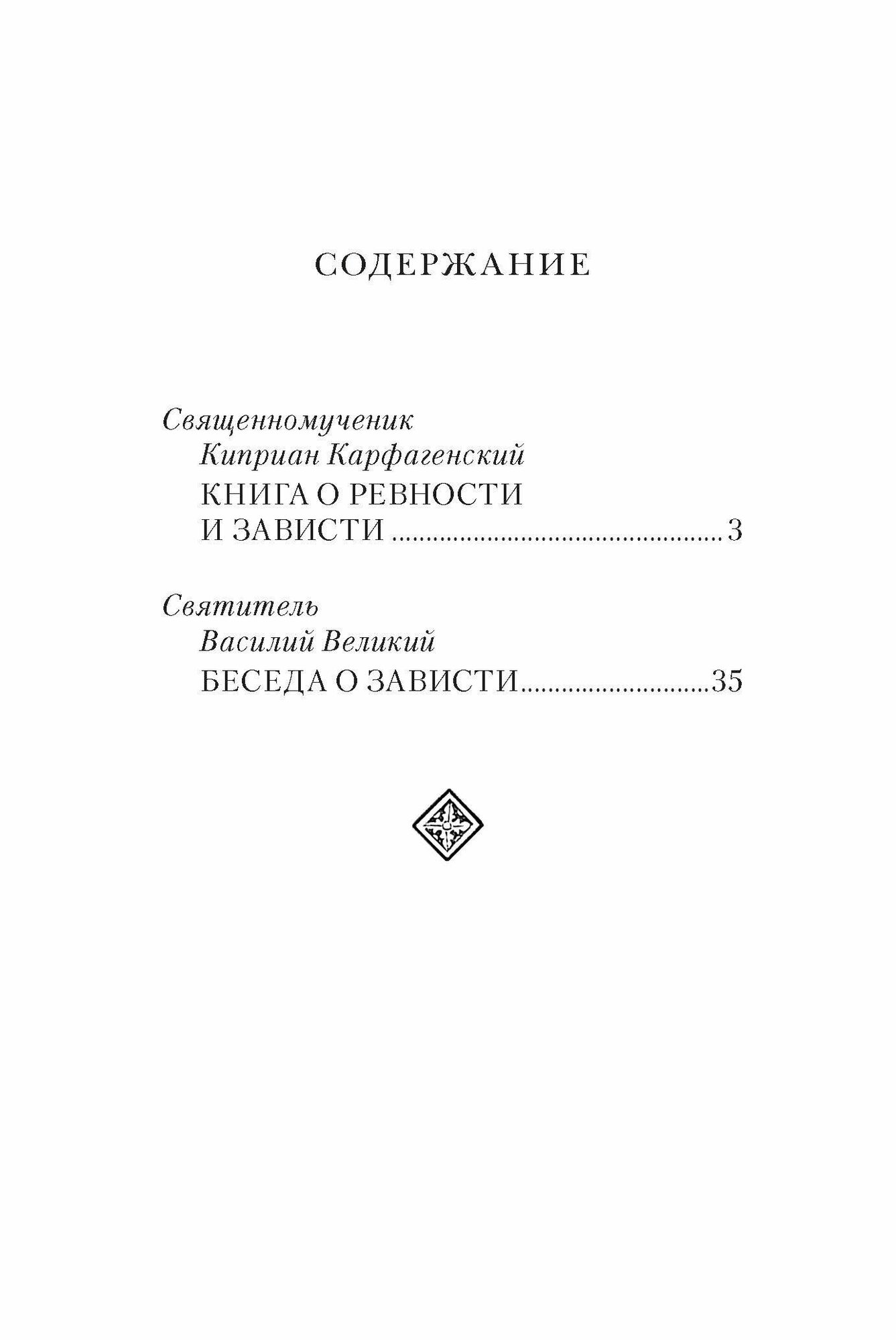 Вниманию читателей предлагаются небольшие сочинения нравственно-аскетического содержания великих святых отцов: Западной Церкви III века священномученика Киприана, епископа Карфагенского (210-258), "Книга о ревности и зависти" и Восточной Церкви IV века святителя Василия Великого, архиепископа Кесарии Каппадокийской (330-379), "Беседа о зависти". Определяя зависть как скорбь о благополучии ближнего, святые Киприан и Василий, как опытные врачи душ человеческих, раскрывают пагубность этого душевного недуга, полную несовместимость его с благостью Божией, указывают связь этой страсти с диаволом, ее тяжкие последствия как для тех, кому завидуют, так и прежде всего для ее носителей, а что еще важнее - показывают, как следует бороться с этой страстью в себе, побеждать и изживать ее, заменяя на доброту, сострадательность и независтливость.