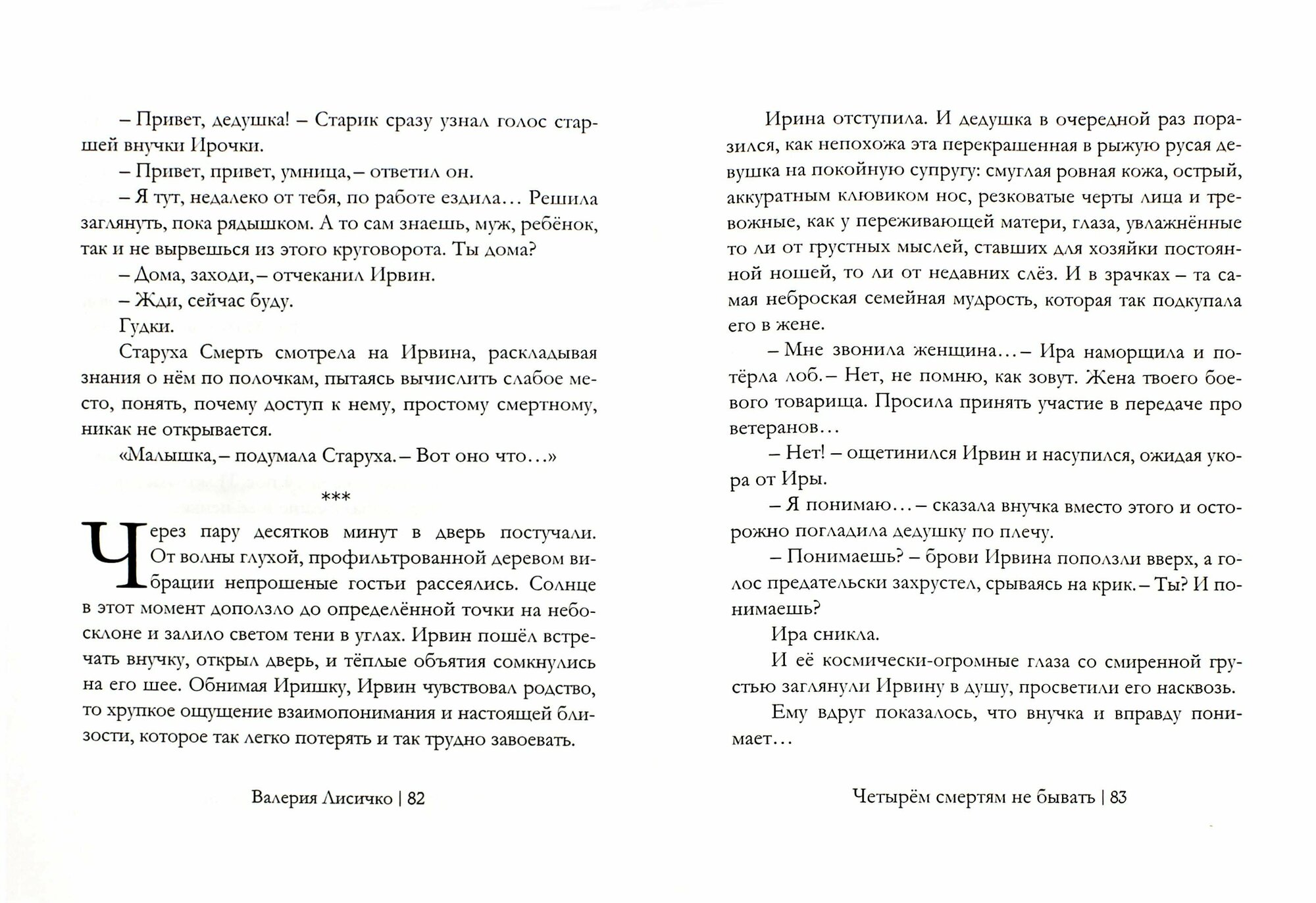 Книга захватывает с первых страниц ! Нереально насыщенная, столько деталей и всё так красиво происходит! Ты и плачешь, и гордишься стариком Ирвином, ветераном, который до последнего стоит на своём! И радуешься за его внучек, с которыми у него такие прекрасные отношения! И он, не смотря на тяжёлый характер, такой мудрый дедушка: не ждёт пока дети и внуки позвонят, проявят внимание, а сам не боиться звонить – подавать пример. А его война со смертями – с этими коварными и элегантными дамами – просто нечто! Как его соблазняет Молодая Смерть, как соревнуется в хитрости и стратегической изворотливости Старуха-Смерть! Ну и образ Малышки смерти, такой трогательной… такой нежной… как лучик надежды! И самое главное нет проседаний – все ответы на поставленные вопросы даются в книге. И все необычности героев оправданы. Но главное, Валерия верна себе и не переступает границы между нашим миром и миром смертей – с ними может общаться только Ирвин. То есть они не вторгаются в наш мир, не оставляют фактов присутствия своего, или улик. Со стороны можно подумать, что Ирвин просто теряет рассудок в его-то возрасте! А ещё страшновато читая, осознать, что старый-старый Ирвин и его старческие метания – это будущее тех, кому сейчас пятьдесят. Книга понравилась! Восторг и эмоции!!!