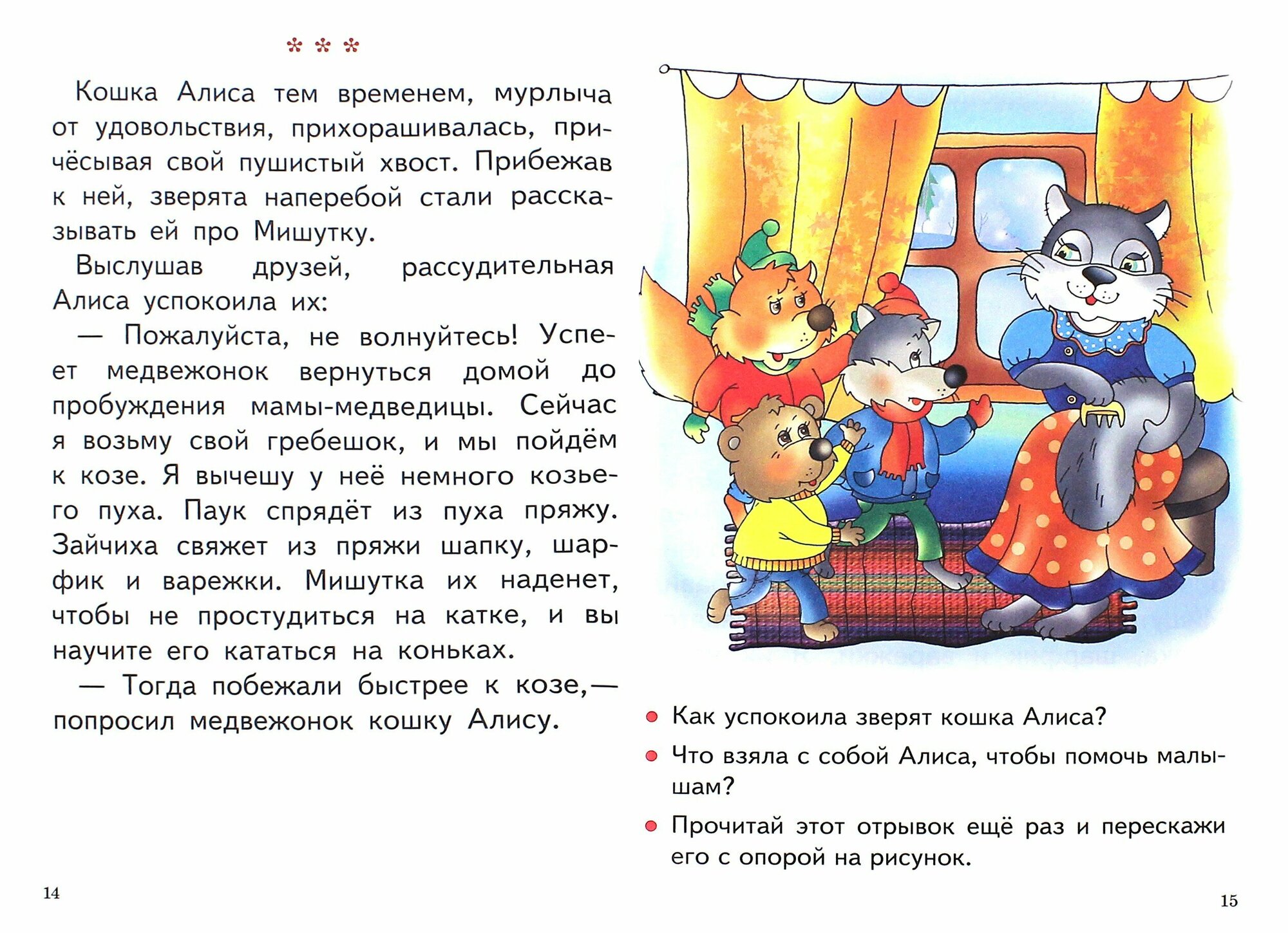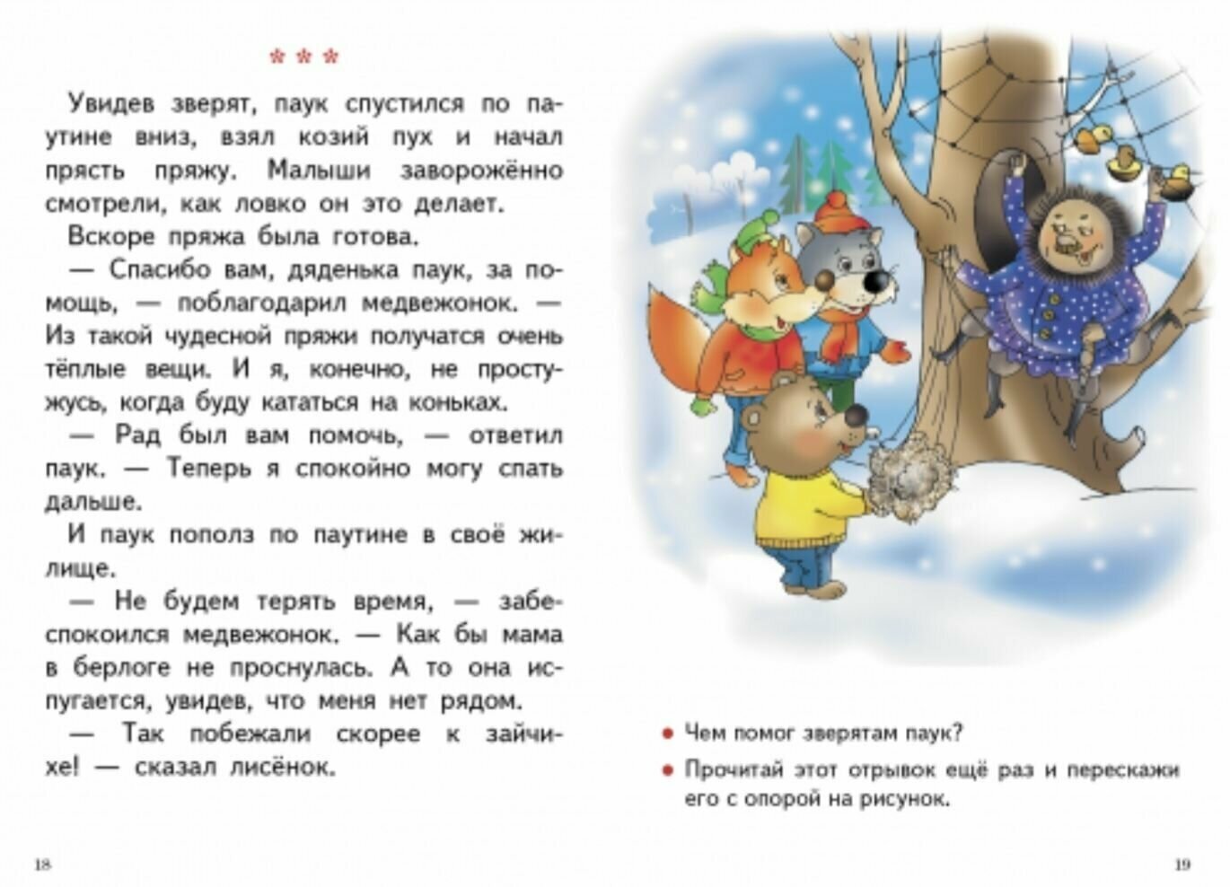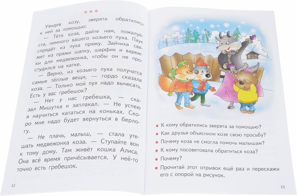 Текст в учебном пособии разбит на отдельные смысловые части, после которых ребенку предлагаются вопросы на понимание прочитанного. Они помогут ему целостно воспринимать текст и разовьют умение говорить полными предложениями.