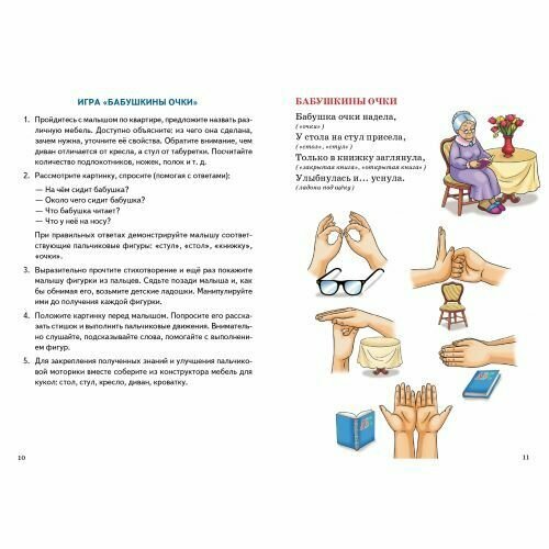 Качество бумаги хорошее, на каждом развороте новая пальчиковая история. Для родителей по пунктам расписано каждое занятие с ребёнком, тут не только сама пальчиковая игра, но и общее развитие ребенка. На мой взгляд интересно, но вот ребенку 3.5 лет сложновато, мальчик, ручки пухленькие, сложно выполнять задания. Поэтому выполняем пока выборочно.