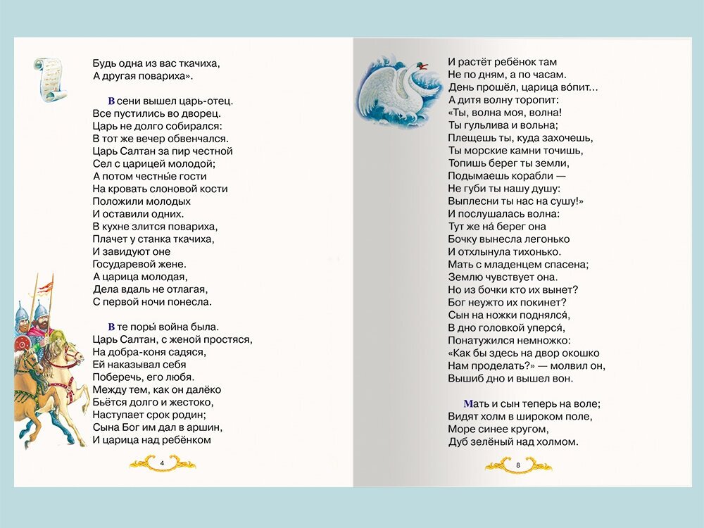 Однажды царь Салтан подслушал под окнами разговор трех сестриц. Потом женился, родился у царя наследник. Да по навету злому, не увидев сына, отправил он жену с ребенком в море, законопатив в бочку. Сломав бочку, выросший не по дням, а по часам царевич Гвидон спас лебедь, оказавшуюся прекрасной царевной, которая отплатила за спасение и службой, и советом, и любовью.