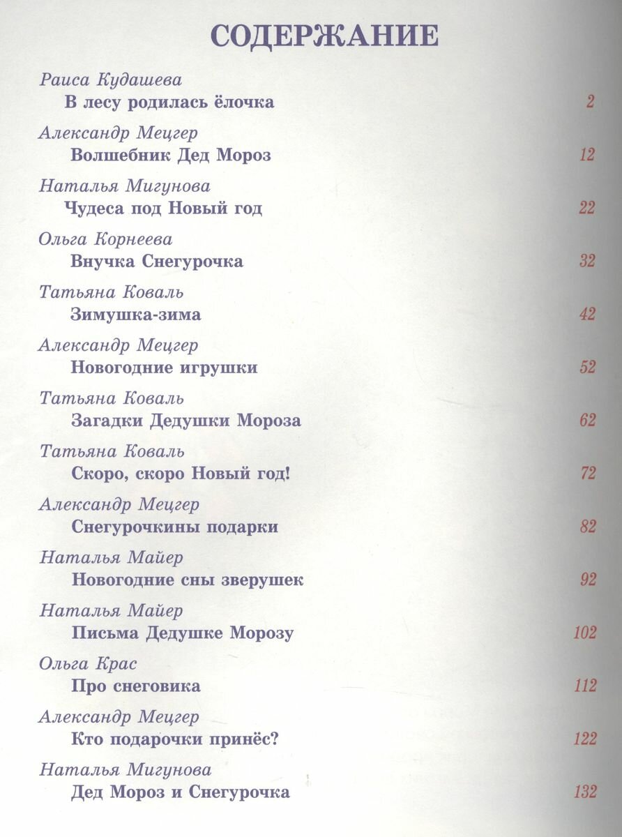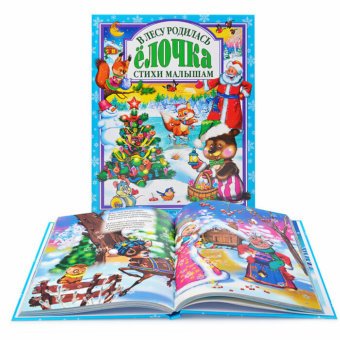 Книгу подарили ребёнку под новый год, но она ещё долго оставалась той самой, главной книгой, которую читаешь каждый вечер, из раза в раз. Прекрасно, ярко оформлена: на каждом развороте большая милая картинка с животными, елочками, дедами морозами и снегурочками. Плотная качественная бумага, запоминающаяся обложка. Текст представляет собой как известные новогодние стихи вроде "В лесу родилась ёлочка", так и новые, вероятно, написанные специально для этого новогоднего сборника. Картинка иллюстрирует одно-два четверостишия. Сами стихи, пусть и не отличаются особой смысловой нагрузкой или красивым слогом, но ребёнку нравятся. В каждом из них бесконечные мишки, белочки и зайки получают подарки от деда мороза, выражая главную детскую мечту этого праздника.