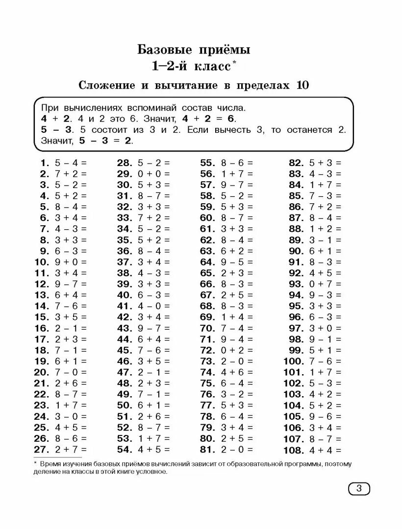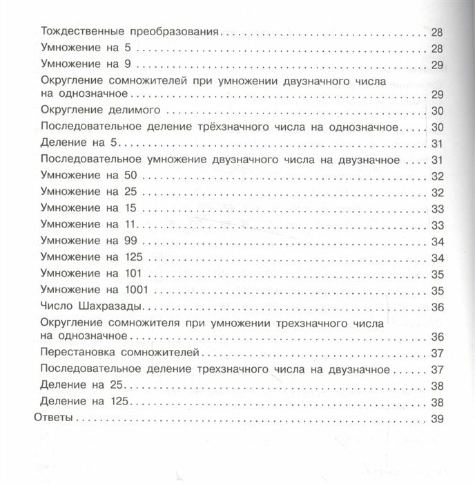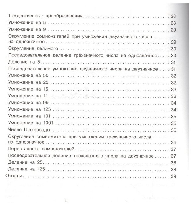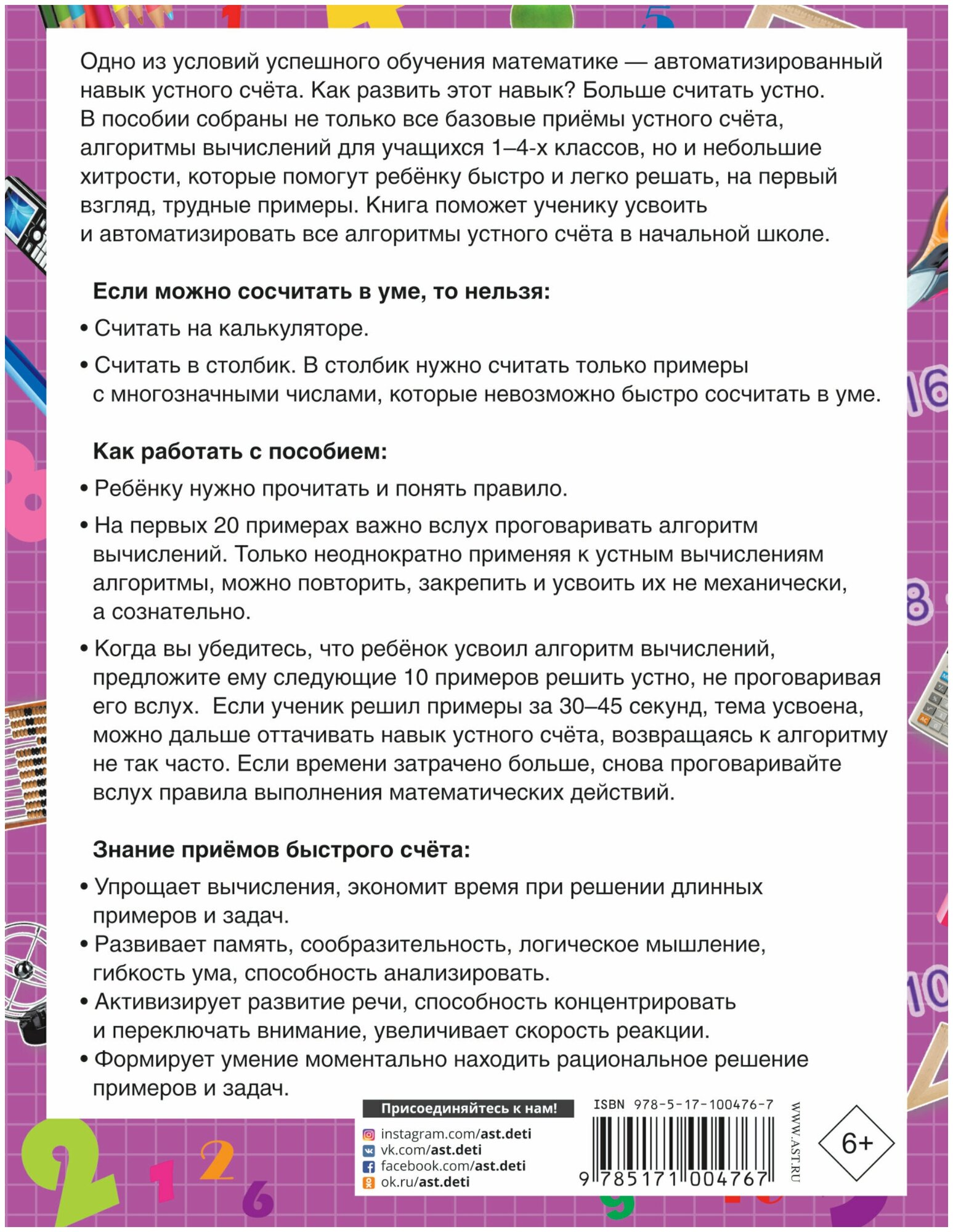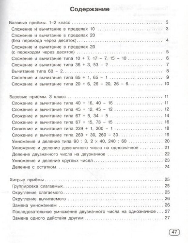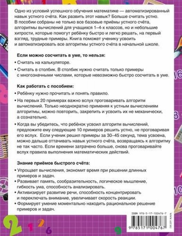 мне понравилась эта книжеца. небольшого формата, небольшая по объему (48 страниц). Авторы книги дают советы, как быстро научить устному счету, а затем идут примеры. Представлены разделы: Базовые приёмы. 1-2 класс. Базовые приемы. 3 класс. Хитрые приёмы. Есть способы для быстрого счета не только для сложения и вычитания, но и для умножения и деления. В конце книги есть ответы. Я думаю, что эта книга пригодится моим детям для овладения устному счету.