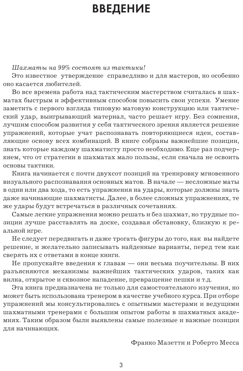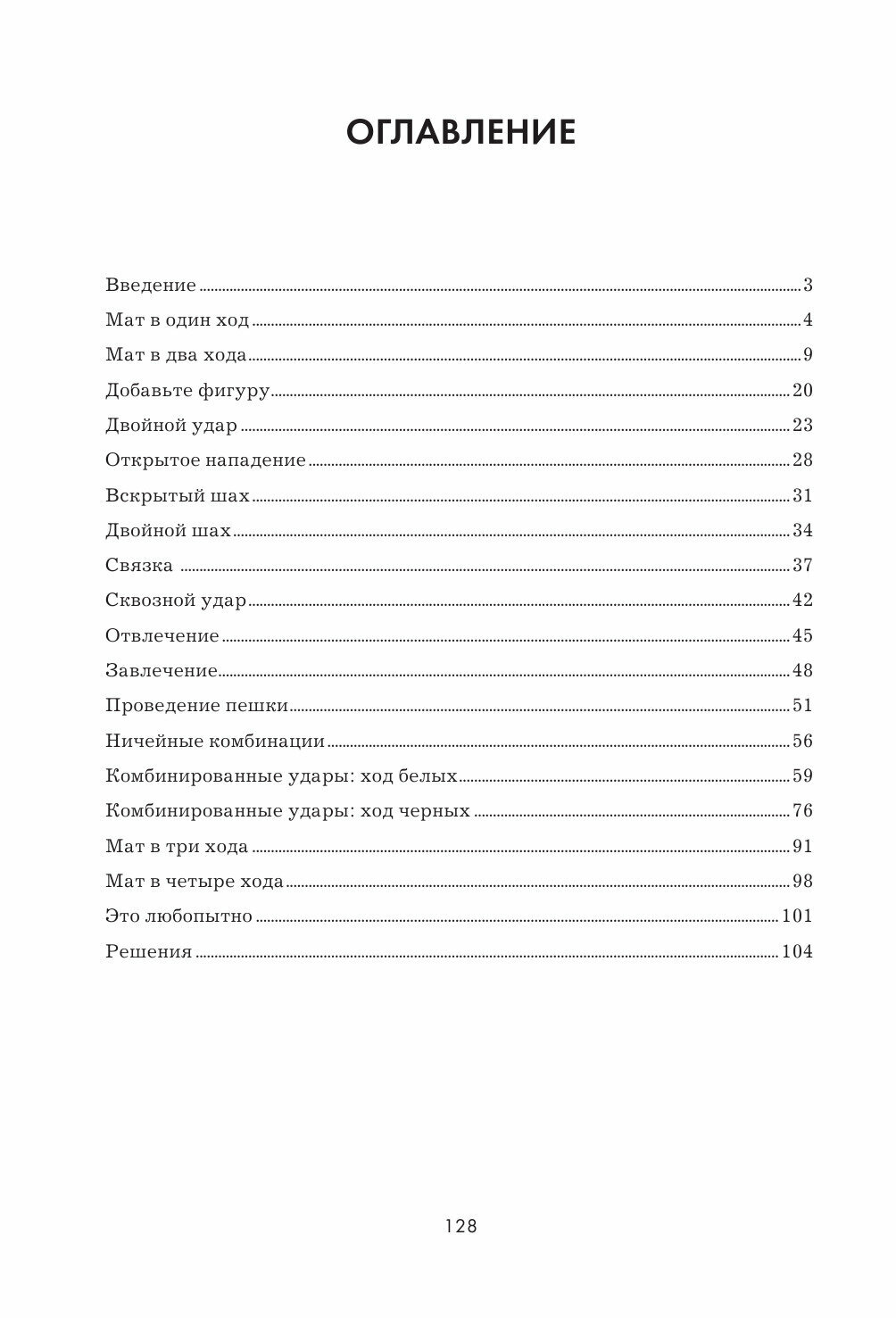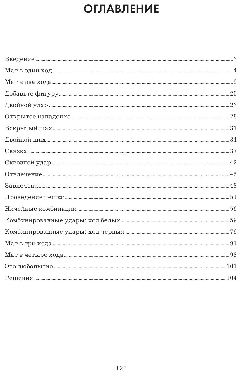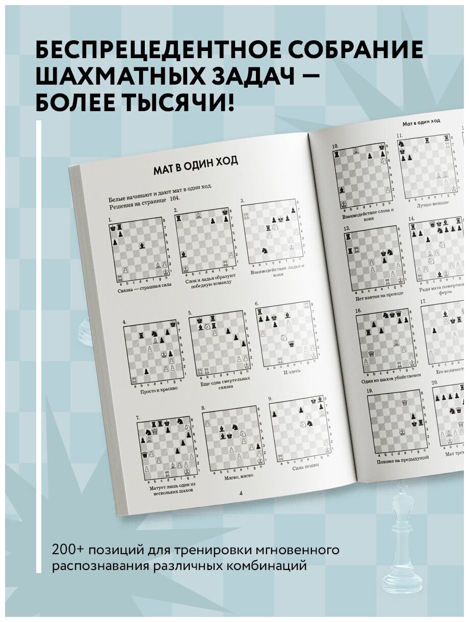 Хороший сборник несложных задач для начинающих шахматистов. Все 1001 диаграммы-комбинации сгруппированы по отдельным тематическим приемам в главы, каждая начинается кратким его описанием. Примеры подобраны, начиная с самых простых и иллюстративных, и движутся в сторону усложнения. Отличительной особенностью сборника являются краткие комментарии к каждой задаче, веселые, иногда с намеком, добавляющие жизни изданию. Максимальная сложность - мат в 4 хода.