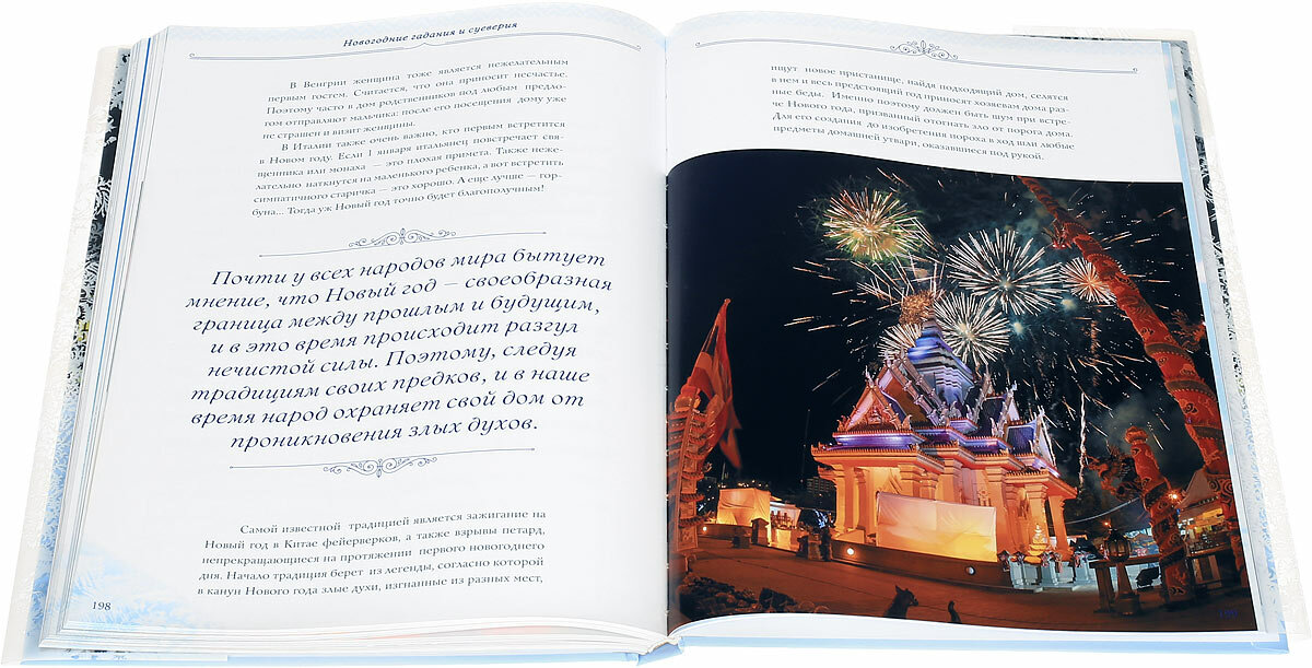 Книга очень красивая и интересная. Читается она быстро и легко. В книге описываются новогодние традиции разных стран мира. Например, было очень интересно узнать как встречают Новый год в разных частях света. Тибет, Афганистан, Япония, Индия, новый год по персидскому календарю, Бирма, Лаос, Эфиопия. Рассказано о Дедах Морозах разных стран, Новогодние приметы и суеверия, традиции в дарении подарков и новогодней одежде. Рассказано также о блюдах, которые должны быть на новогоднем столе в разных странах-Франции, Великобритании, Голландии, Австрии, Германии, Венгрии и др. Например во многих странах нельзя ставить блюда из птицы: считается, что с ней улетит счастье. Из книги узнала, что традиция дарения подарков пришла к нам из Древнего Рима, где дарили ветви из лавра, символизирующие счастье и удачу. Советую эту книгу всем, кто любит этот замечательный праздник хочет знать о нем все.