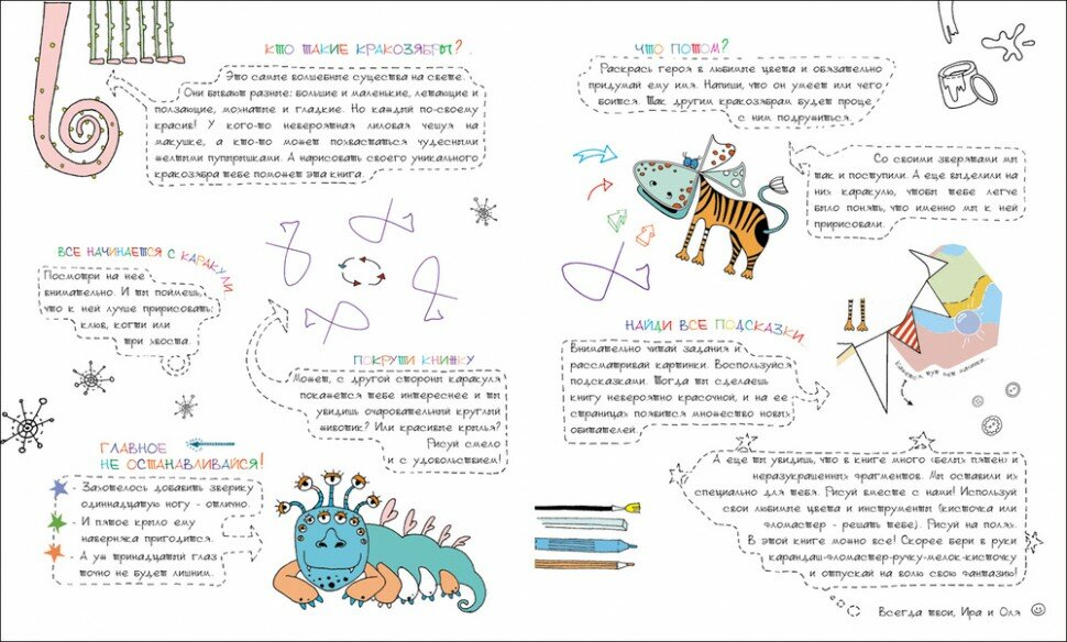 Смелые и веселые книжки-рисовалки, в которых простые каракули с помощью пары цветных штрихов превращаются в самых разных зверей и загадочных существ – «кракозябр». На каждом развороте юных креативщиков ждут задания, в которых им предстоит догадаться, что именно нужно дорисовать к исходным закорючкам, чтобы получился нужный зверь!