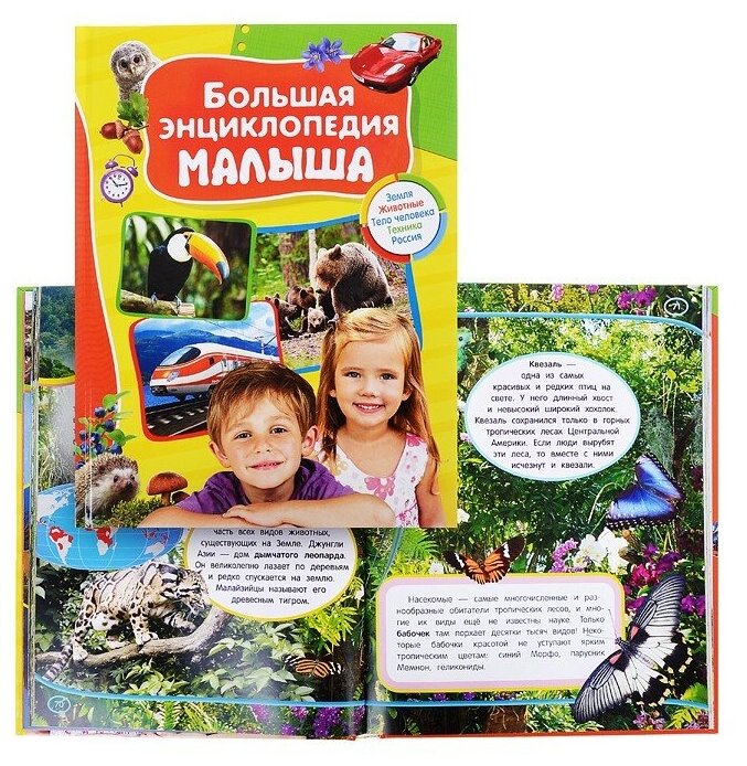 Большая энциклопедия малыша понравилась мне ещё в книжном магазине. Не нужно покупать несколько книг, а можно только 1, где собрана вся информация для расширения кругозора ребёнка. Рассказывается о растениях, животных, теле человека, анатомии человека. Интересно рассказывается о технике, об окружающем мире. Обо всём, что окружает ребёнка в мире. Покупкой довольна.