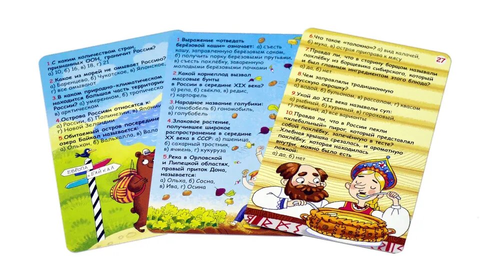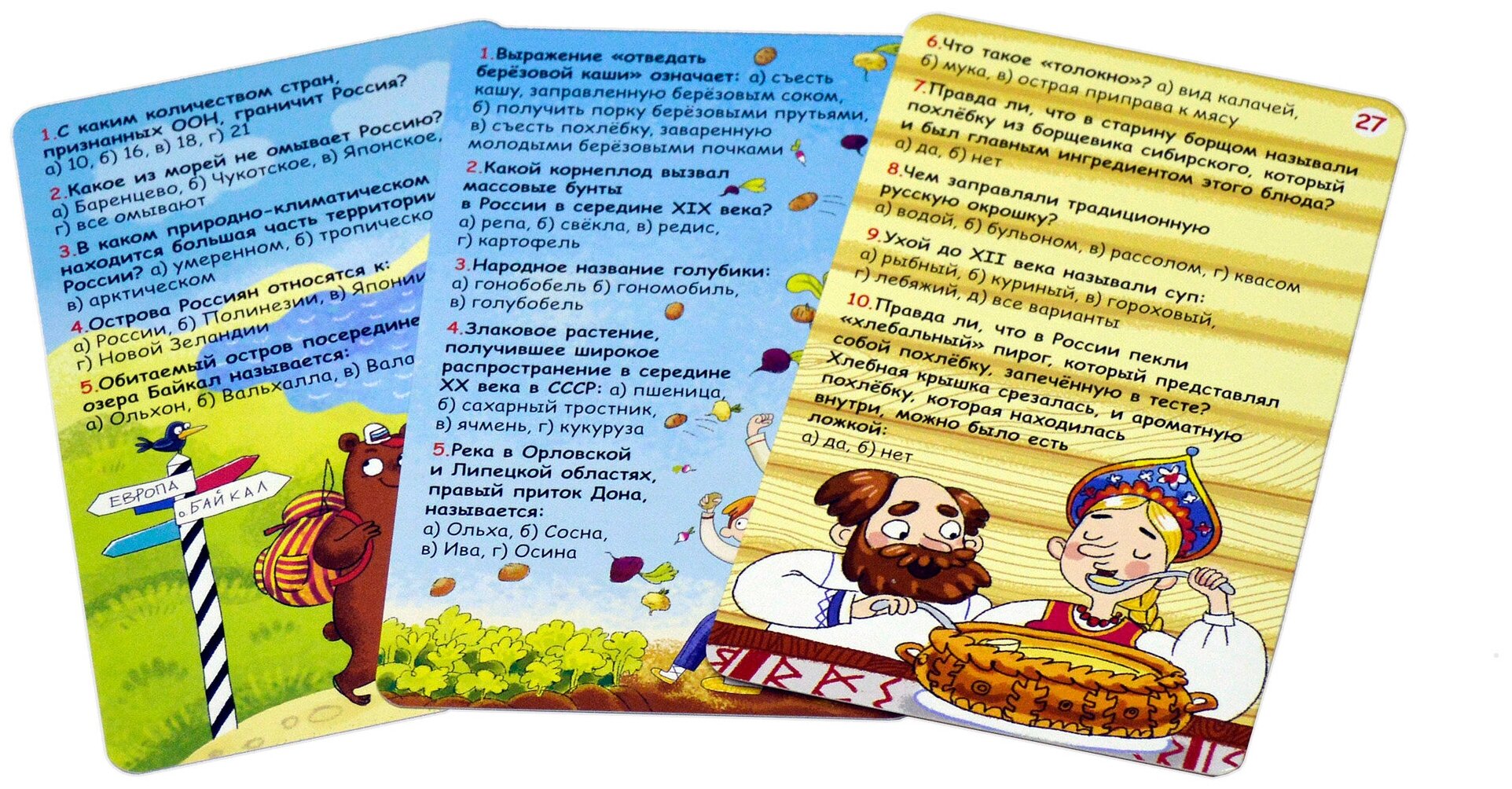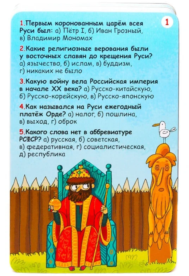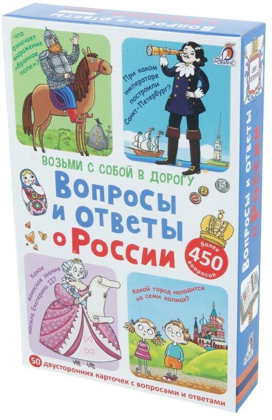 Как звали самого высокого монарха России? Кто основал Москву? Сколько платьев было у императрицы Елизаветы Петровны? На какой праздник пекут куличи? Что такое стрежень? Что такое русский Кремль? Всё самое-самое интересное о России от истоков до современности в вопросах, фактах и забавных иллюстрациях. Внутри этого набора из 50 двухсторонних карточек вы найдете более 450 вопросов и интересных фактов о России – от истоков до современности, о культуре и истории, о географии и русском быте, о литературе и письменности и многом другом. А забавные иллюстрации помогут ответить на некоторые вопросы и поближе познакомится со своей страной.
