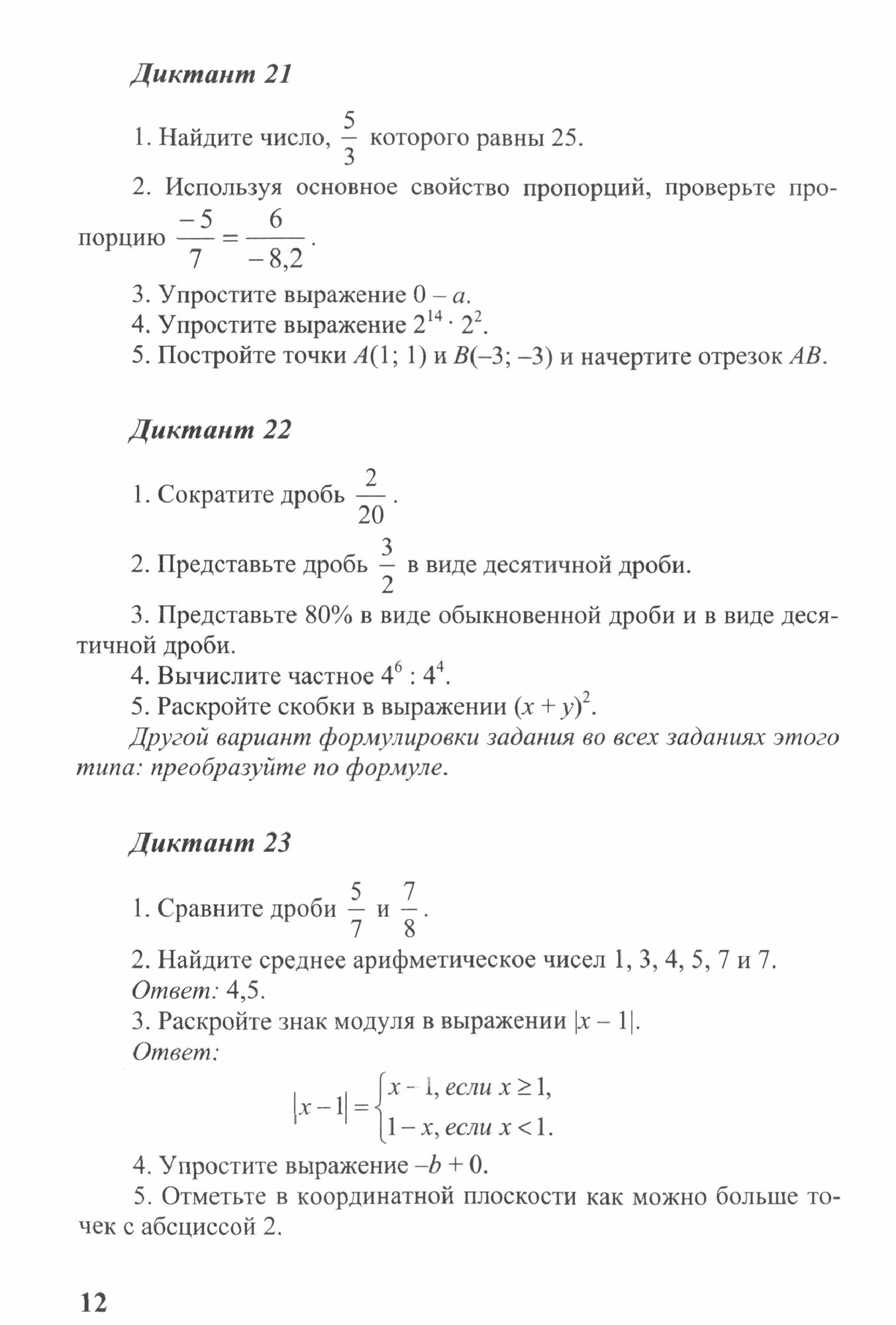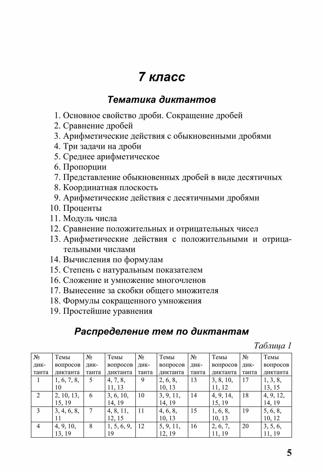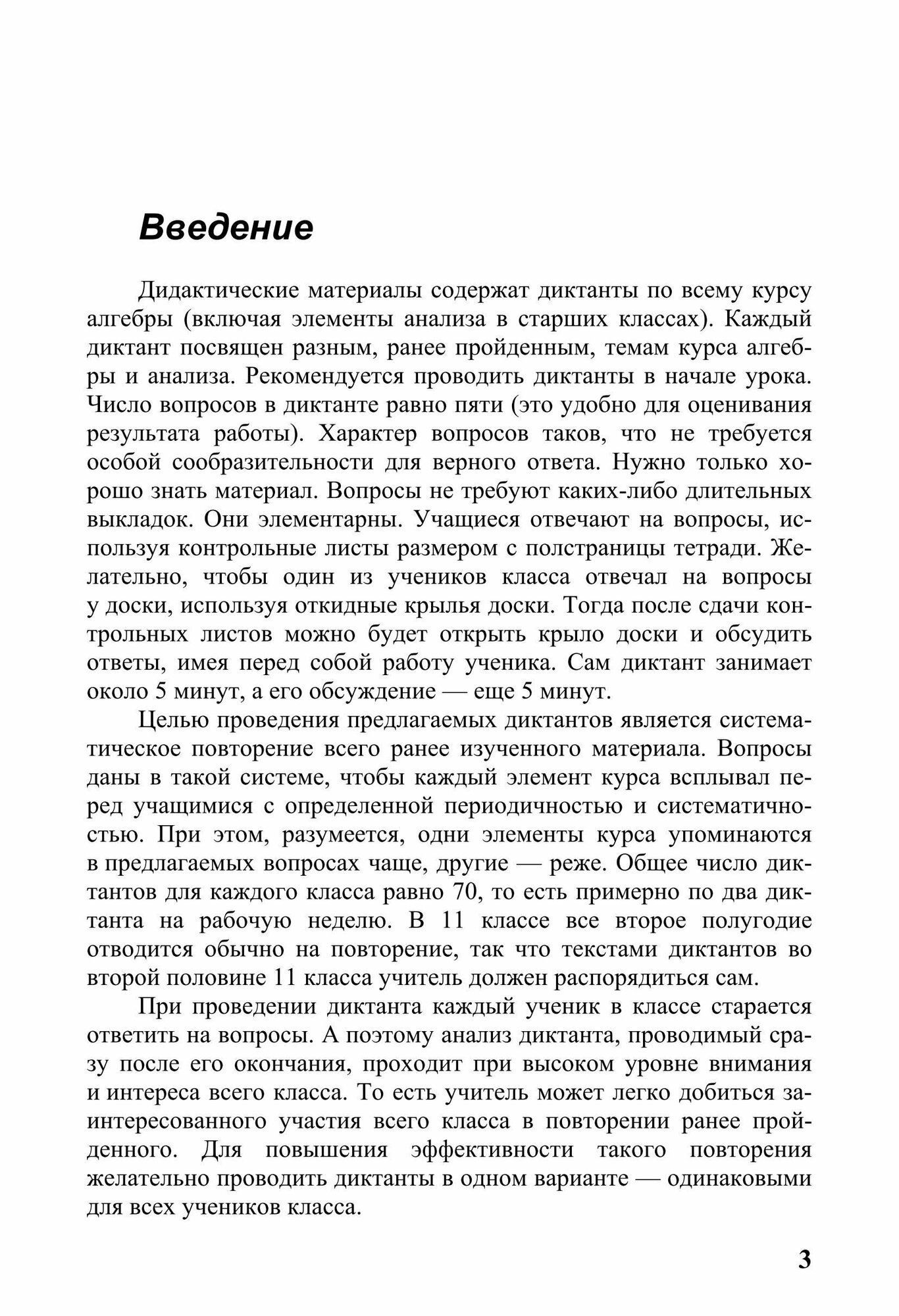 Дидактические материалы содержат диктанты по всему курсу алгебры (включая элементы анализа в старших классах). Каждый диктант посвящен разным, ранее пройденным, темам курса алгебры и анализа. Рекомендуется проводить диктанты в начале урока. Число вопросов в диктанте равно пяти (это удобно для оценивания результата работы). Характер вопросов таков, что не требуется особой сообразительности для верного ответа. Нужно только хорошо знать материал.