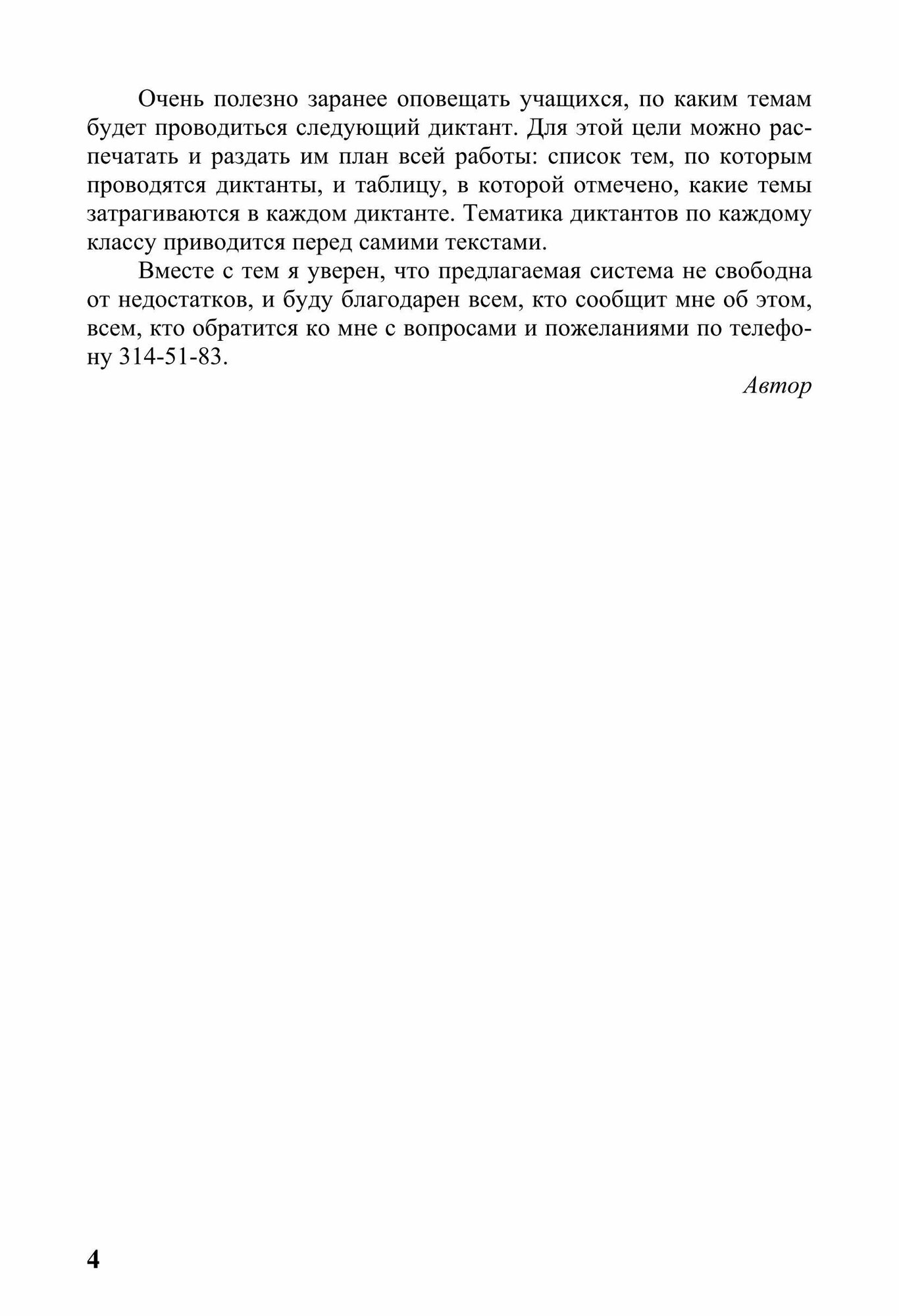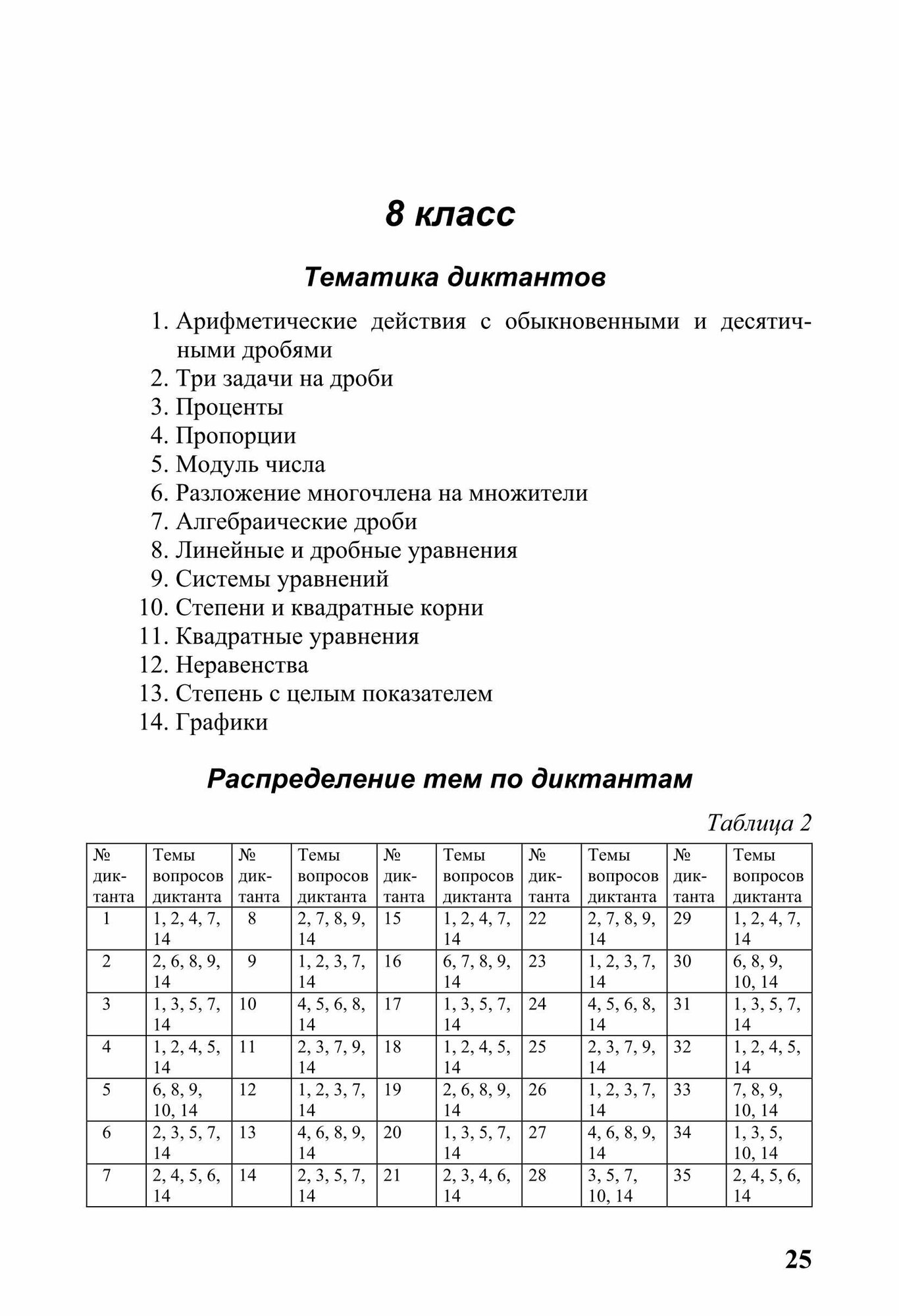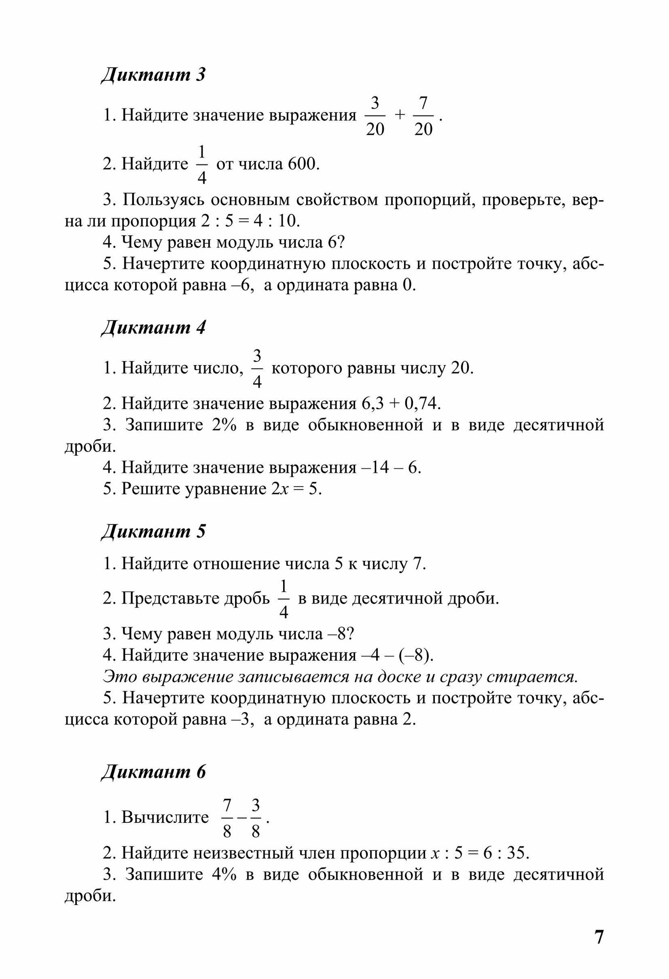 Дидактические материалы содержат диктанты по всему курсу алгебры (включая элементы анализа в старших классах). Каждый диктант посвящен разным, ранее пройденным, темам курса алгебры и анализа. Рекомендуется проводить диктанты в начале урока. Число вопросов в диктанте равно пяти (это удобно для оценивания результата работы). Характер вопросов таков, что не требуется особой сообразительности для верного ответа. Нужно только хорошо знать материал.