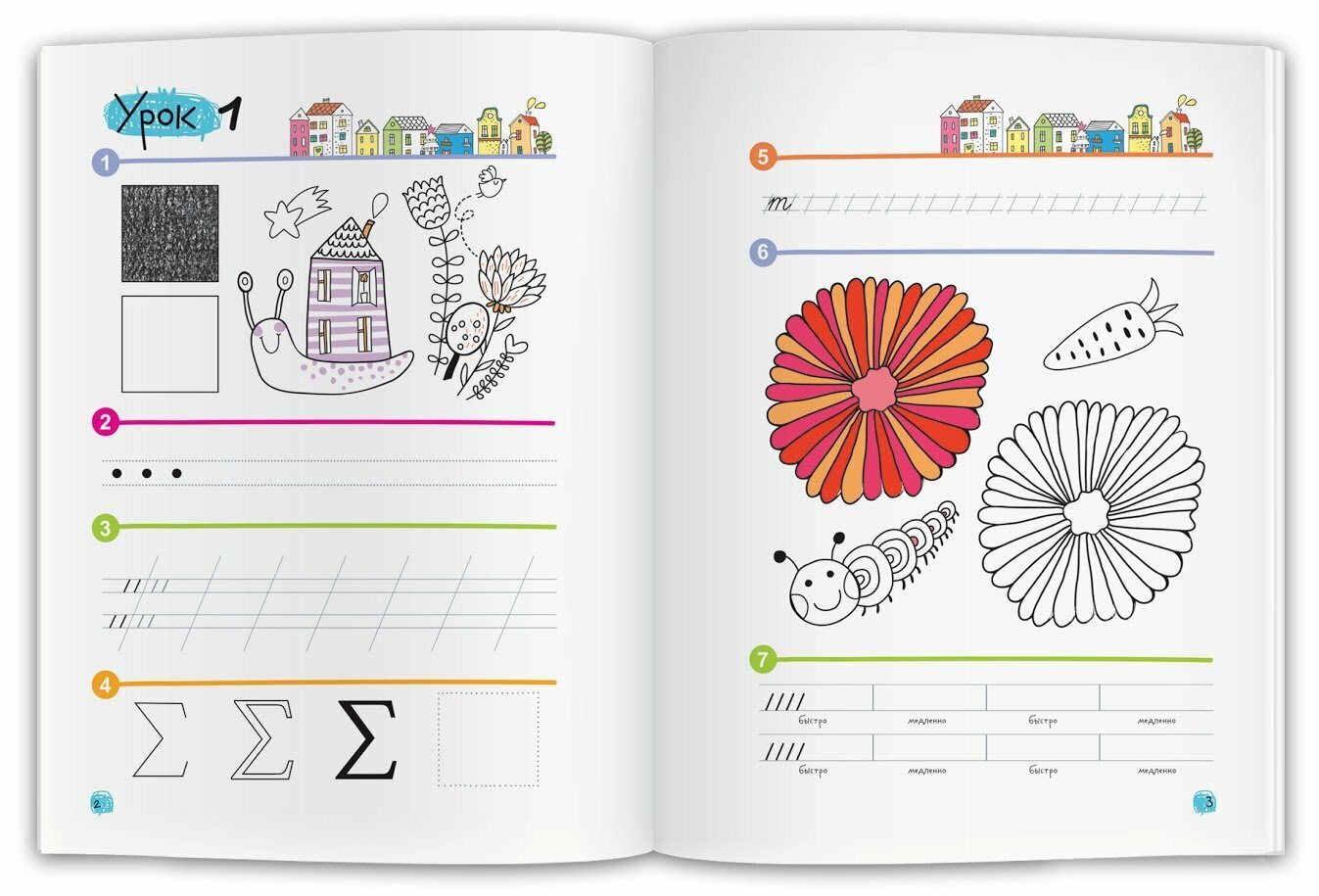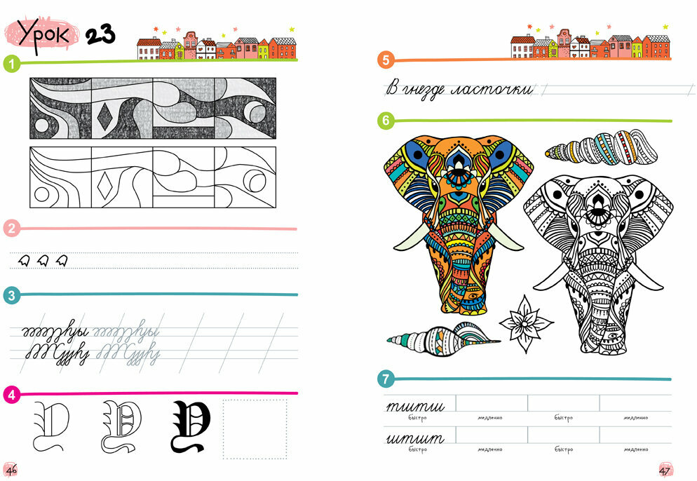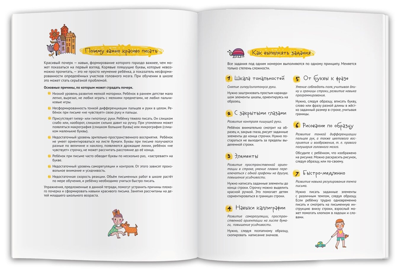 Красивый почерк — навык, формирование которого гораздо важнее, чем может показаться на первый взгляд. Корявые плящущие буквы — это не просто небрежность ребёнка, а показатель несформированности определённых участков головного мозга. При обучении в школе это может стать серьёзной проблемой. Упражнения, предложенные в данной тетради, помогут ребёнку развить соответствующие участки мозга и выработать красивый почерк. Ребёнок научится снимать гипер/гипотонус руки и контролировать пишущую руку, соблюдать границы строки, плавно переключаться с одной графемы на другую, регулировать темп письма; разовьёт пространственную ориентацию в строке, усидчивость, тонкую дифференциацию пальцев рук, цветовое восприятие и воображение, т. е. правое полушарие мозга. Занятия построены по принципу от простого к сложному и рассчитаны на детей от 5 лет.