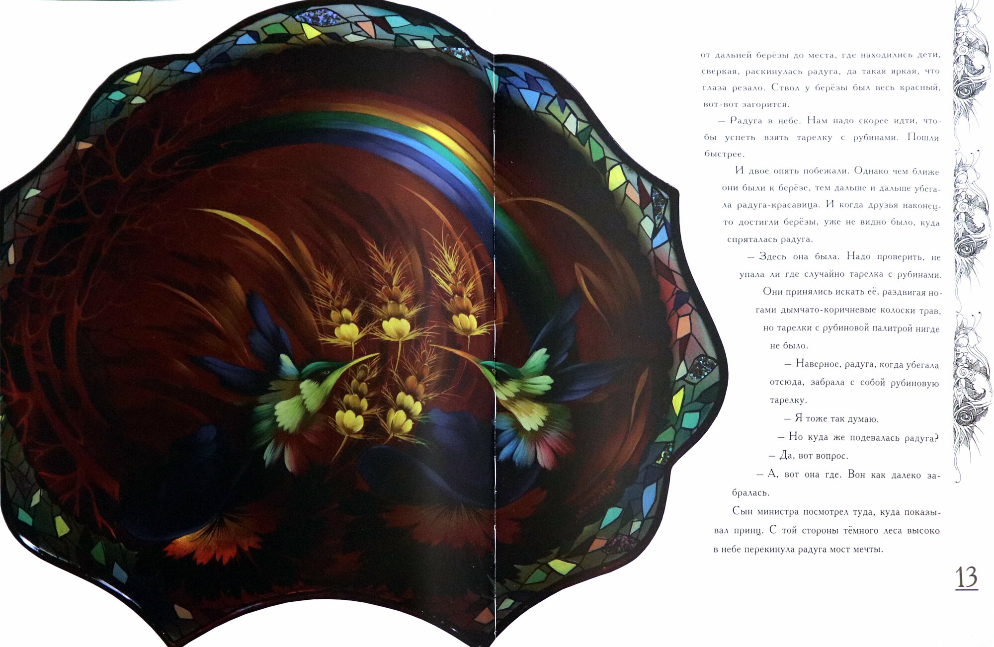 Но это же сказка, а не художественный альбом. И покупала я её, чтобы ЧИТАТЬ, и, желательно, с удовольствием. Не получилось! На стр.3 написано: ... идти за руку друг с другом. Русский фразеологизм звучит как "идти рука об руку " . На стр.19 я споткнулась о деепричастный оборот, не поняла, кто сказал, кто слетел. После этого уже совсем не хотелось читать дальше. Ну и издержки перевода: стр.18 - видимо, в оригинале была калька с английского ????? (velvet). Это, всё-таки, бархат (речь идёт о накидке принца). А на странице 21 сталкиваемся с загадочным крисоколлом)). На самом деле, это хризоколла (женского рода).Но это понятие собирательное, и в данном случае лучше было употребить слово малахит ( речь идёт о листьях).
