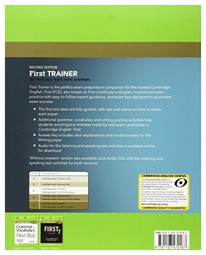 Six full practice tests with tips and training for the 2015 revised Cambridge English: First (FCE). First Trainer offers six practice tests for the revised Cambridge English: First (FCE) exam combined with easy-to-follow guidance and exam tips. The first two tests are fully guided with advice on how to tackle each paper. Extra practice activities, informed by the Cambridge Learner Corpus, a bank of real candidates exam papers, focus on areas where students typically need the most help. This edition contains a full answer key. Audio for the listening and speaking test activities is available online for download. Audio CDs featuring the listening material are also available, separately.