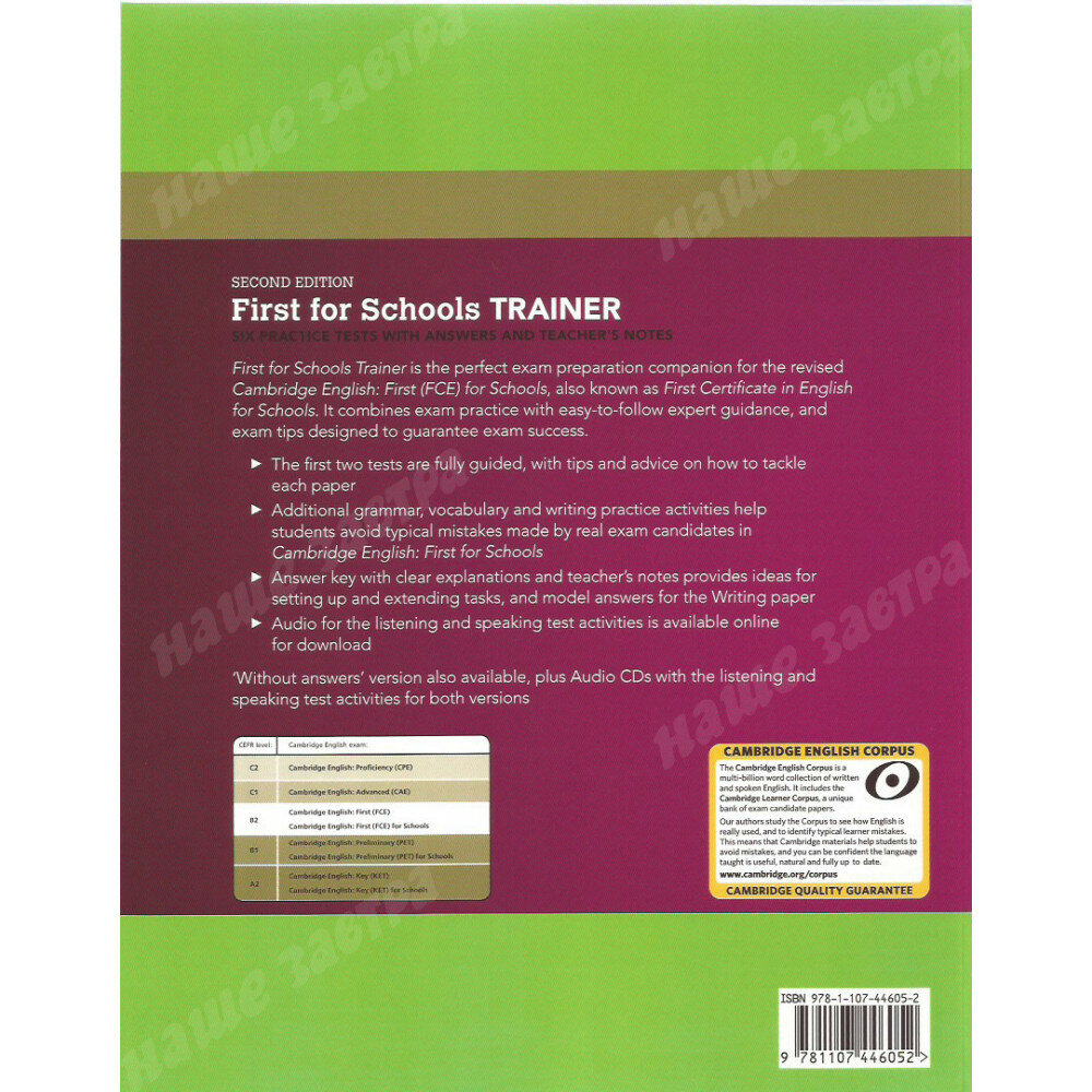 Six full practice tests with tips and training for the 2015 revised Cambridge English: First (FCE) for Schools. First for Schools Trainer offers six practice tests for the revised Cambridge English: First (FCE) for Schools exam combined with easy-to-follow guidance and exam tips. The first two tests are fully guided with advice on how to tackle each paper. Extra practice activities, informed by the Cambridge Learner Corpus, a bank of real candidates' exam papers, focus on areas where students typically need most help. This edition contains teachers notes and a full answer key. Audio for the listening and speaking test activities is available online for download. Audio CDs featuring the listening material are also available, separately.
