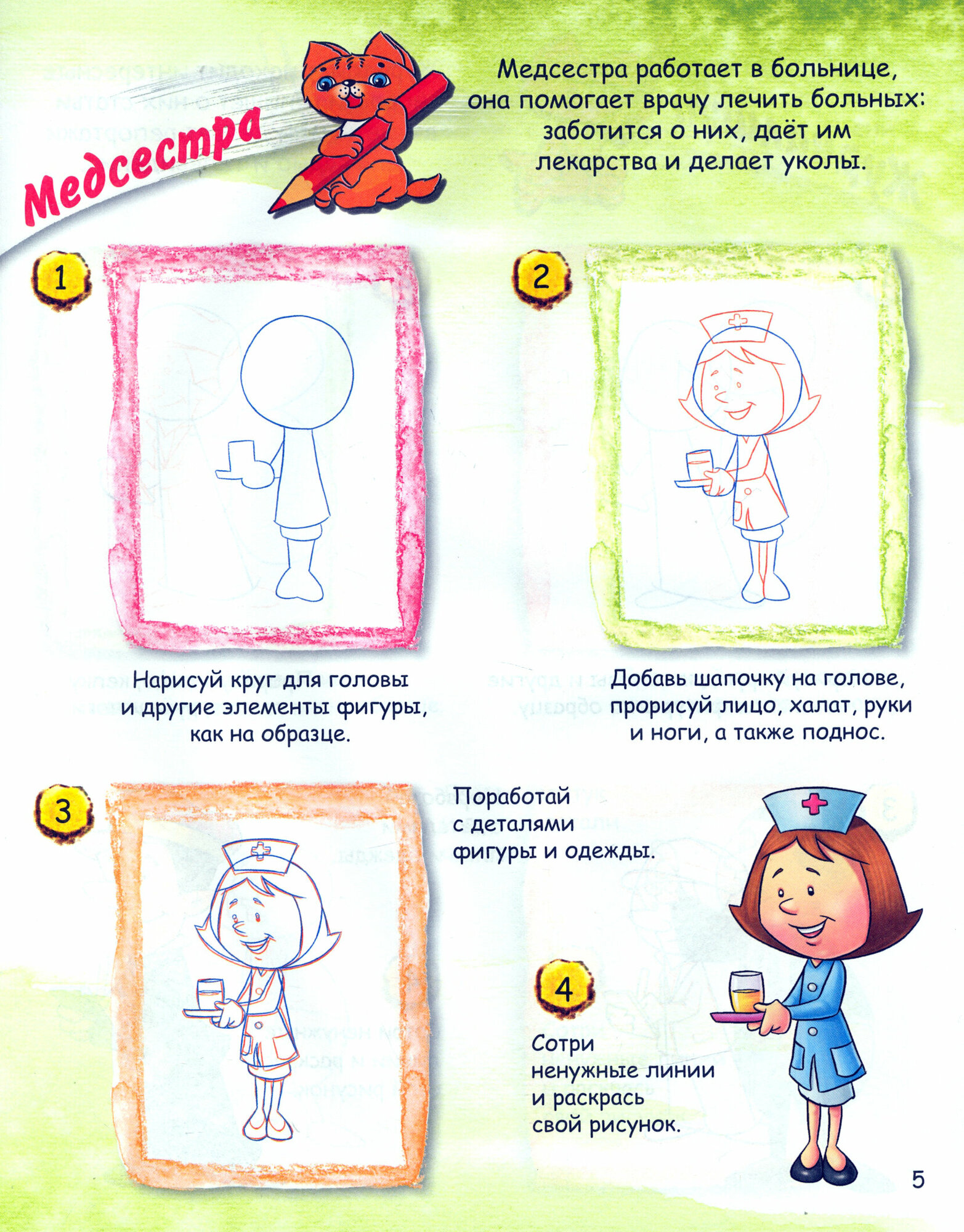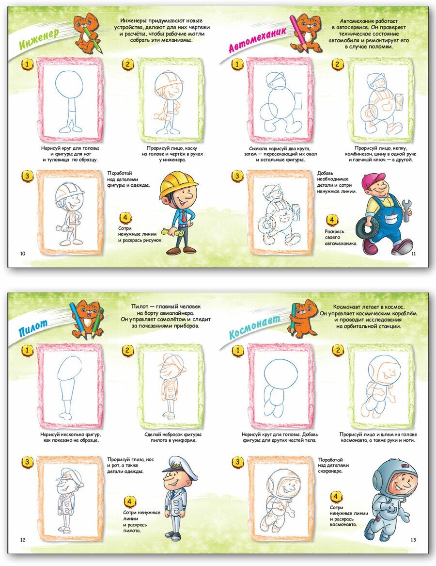 Дети очень любят рисовать, но не всегда знают, с чего начать. Книга «Профессии» из серии «Учимся рисовать с котёнком» содержит пошаговые наглядные инструкции по рисованию людей — представителей разных профессий. Она поможет развить художественные способности ребёнка. Оранжевый Котёнок расскажет, чем занимается каждый персонаж, чтобы дети лучше могли его представить. С Оранжевым Котёнком ребёнок рисует, играет, познаёт.