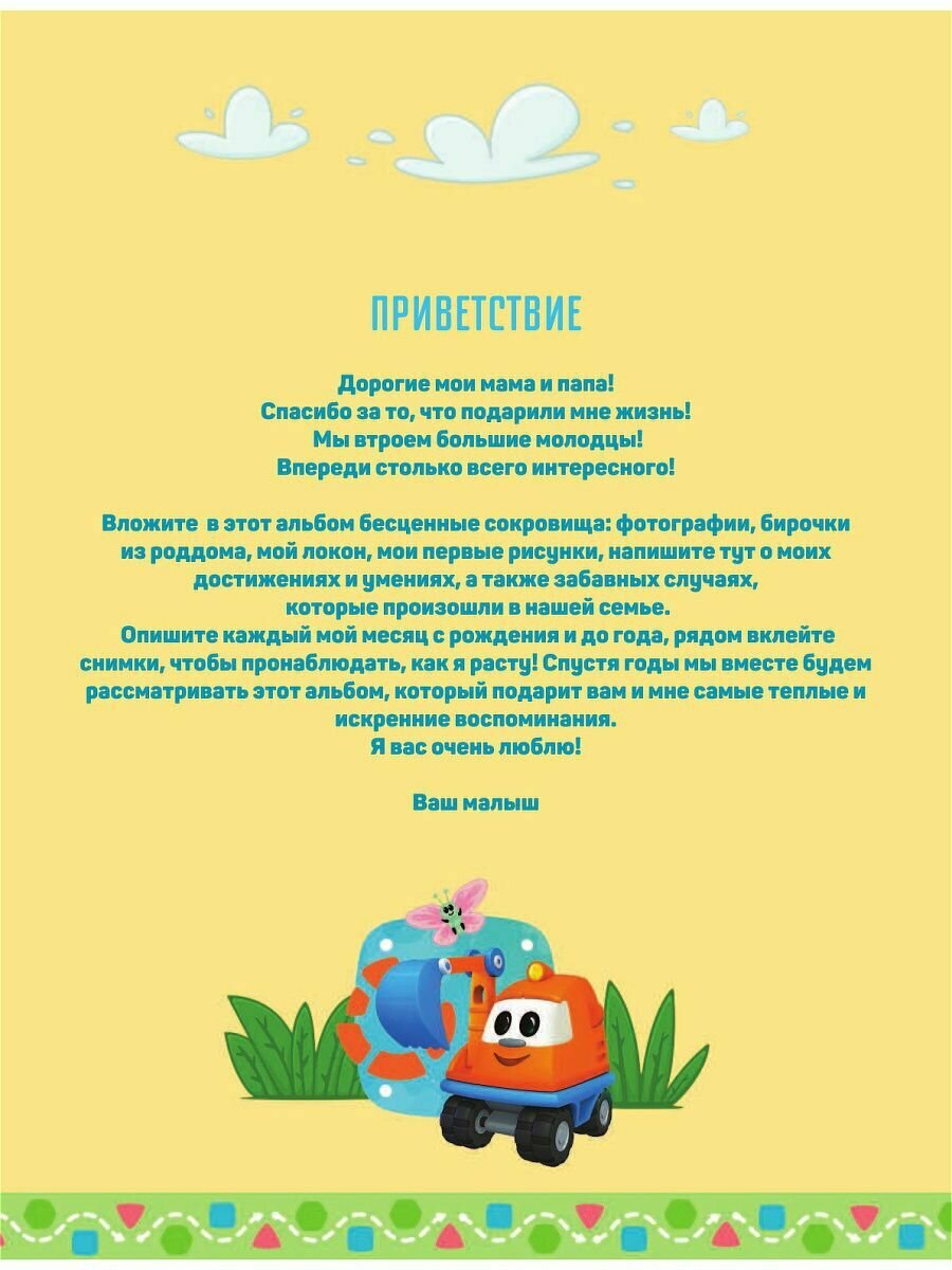 Одно из самых замечательных событий в семье - появление на свет малыша. И хочется запомнить каждое мгновение жизни, проведенное рядом с ним. В этом вам поможет альбом, который вы держите в руках. Записывайте трогательные истории, вклеивайте фотографии, фиксируйте каждое памятное событие - и потом вы сможете раз за разом возвращаться в эти моменты, вспоминая их с теплотой и любовью. Альбом станет замечательным подарком для всех любящих родителей, ведь каждый малыш уникален!