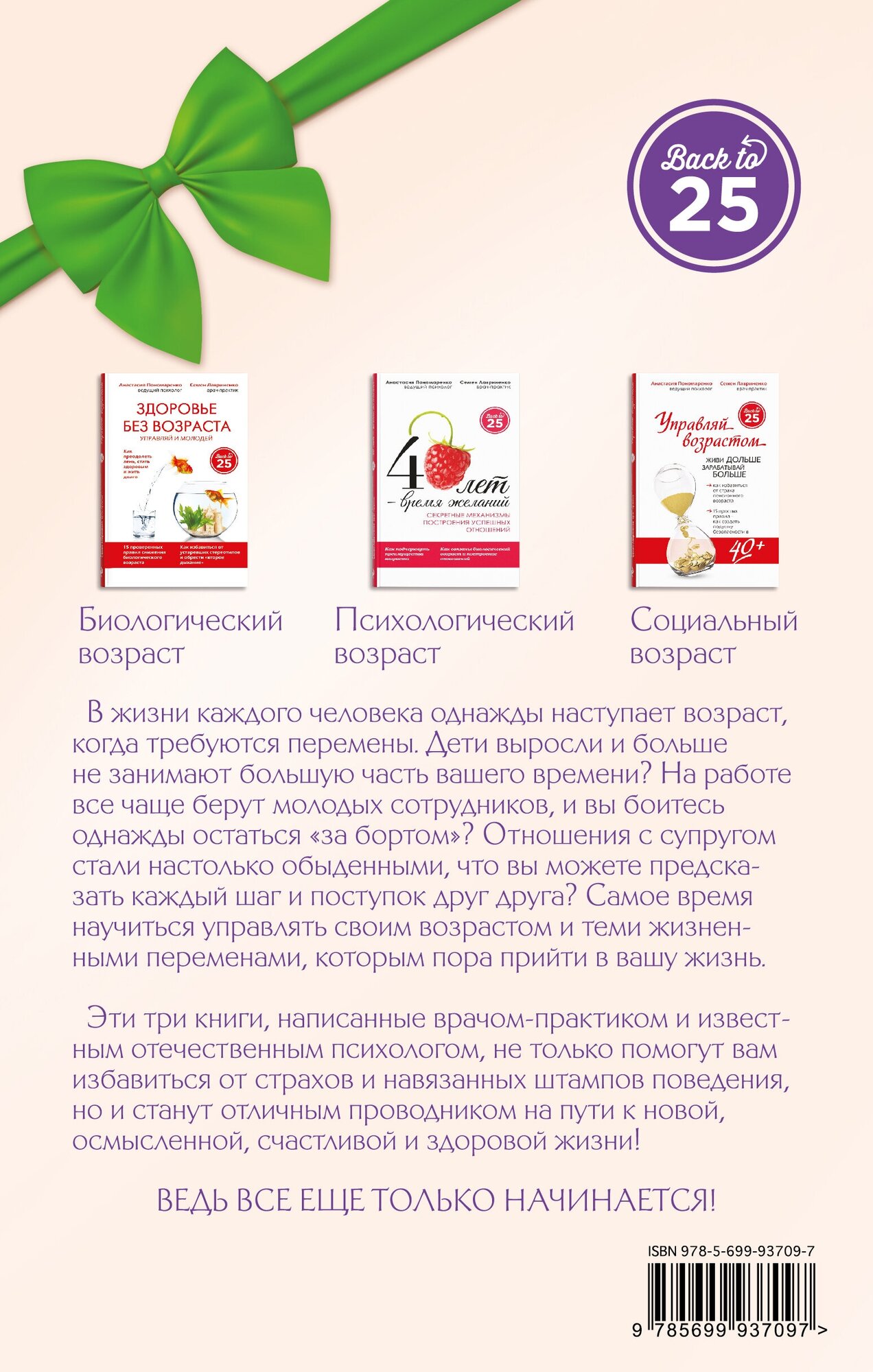 .понимает, что ощущение молодости тесно связано с биологическим, психологическим и социальным возрастом. Профессиональная занятость часто выходит на первое место, поэтому вы можете начать сразу с третьей книги психолога Анастасии Пономаренко и врача Семена Лавриненко, а уже позже прочитать "Измени свой биологический возраст" и "40 лет - время желаний".