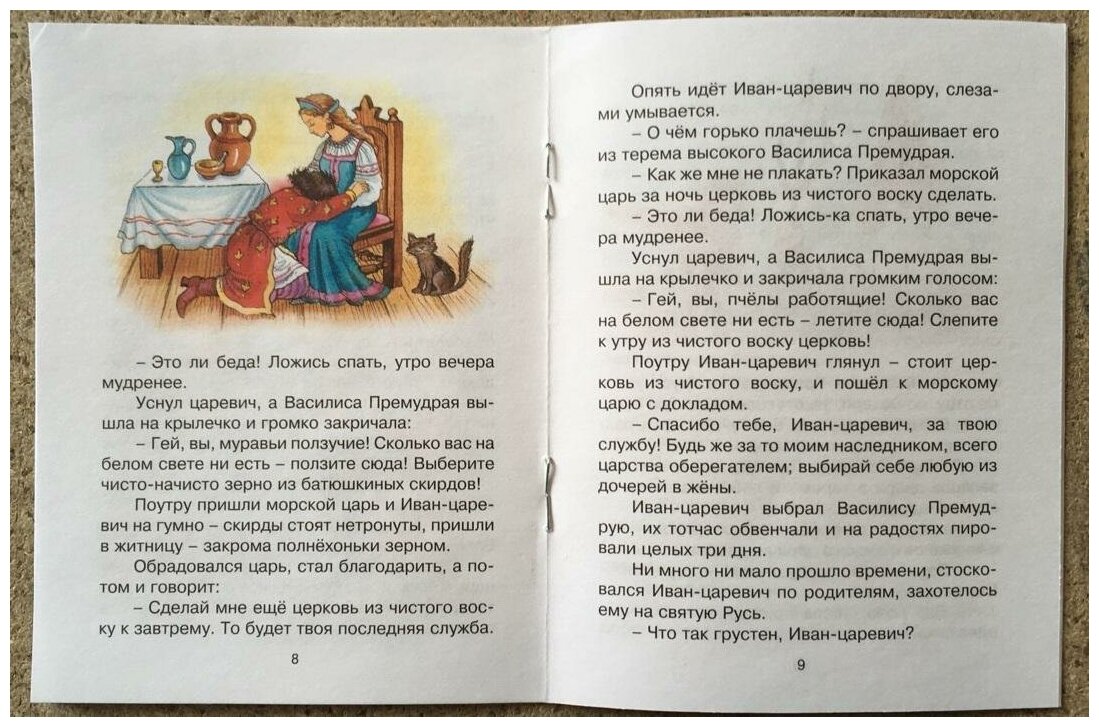 Книжечка небольшого формата, как и многие другие, выпущенные в этой серии. Шрифт достаточно мелкий, иллюстраций немного, что объясняется небольшим количеством листов, в которые необходимо было уложить довольно длинный рассказ. А вот обработка сказки не очень понравилась - предложения получились очень длинные, с большим количеством знаков препинания, сложные для прочтения и понимания. Думаю, что от употребления некоторых старорусских слов автору можно было воздержаться... почему все персонажи используют простое восклицание "эй", а Василиса Премудрая постоянно кричит "гей, вы, слуги...", "гей, вы, пчёлы..."!? К качеству книги за такую цену нет.