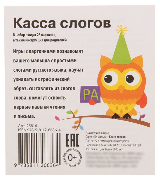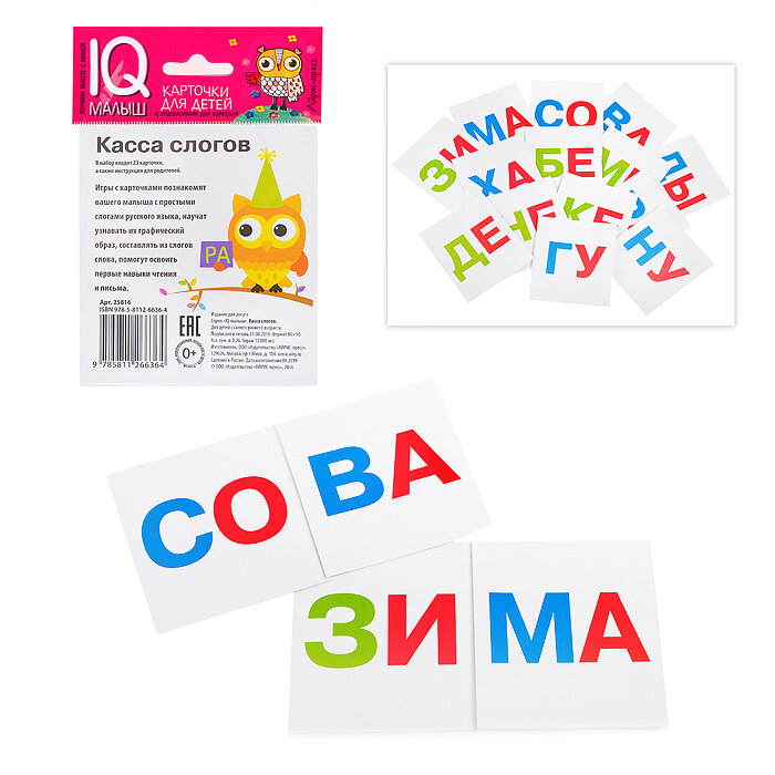 В набор "Касса слогов" входит 23 двусторонних карточки со слогами и карточка с инструкцией для взрослых. "Касса слогов" познакомит малыша с некоторыми слогами русского языка. На карточках представлены два вида слогов: слоги с твёрдыми согласными (даны синим цветом) и слоги с мягкими согласными (даны зелёным цветом). Карточки этого набора позволяют проводить разнообразные игры, цель которых - научить малыша читать слоги с твёрдыми и мягкими согласными, определять на слух место данного слога в слове, отличать его от других слогов и составлять из слогов простые слова. Игры с карточками предназначены для всех маленьких детей - от малышей с первых дней жизни до дошкольников.