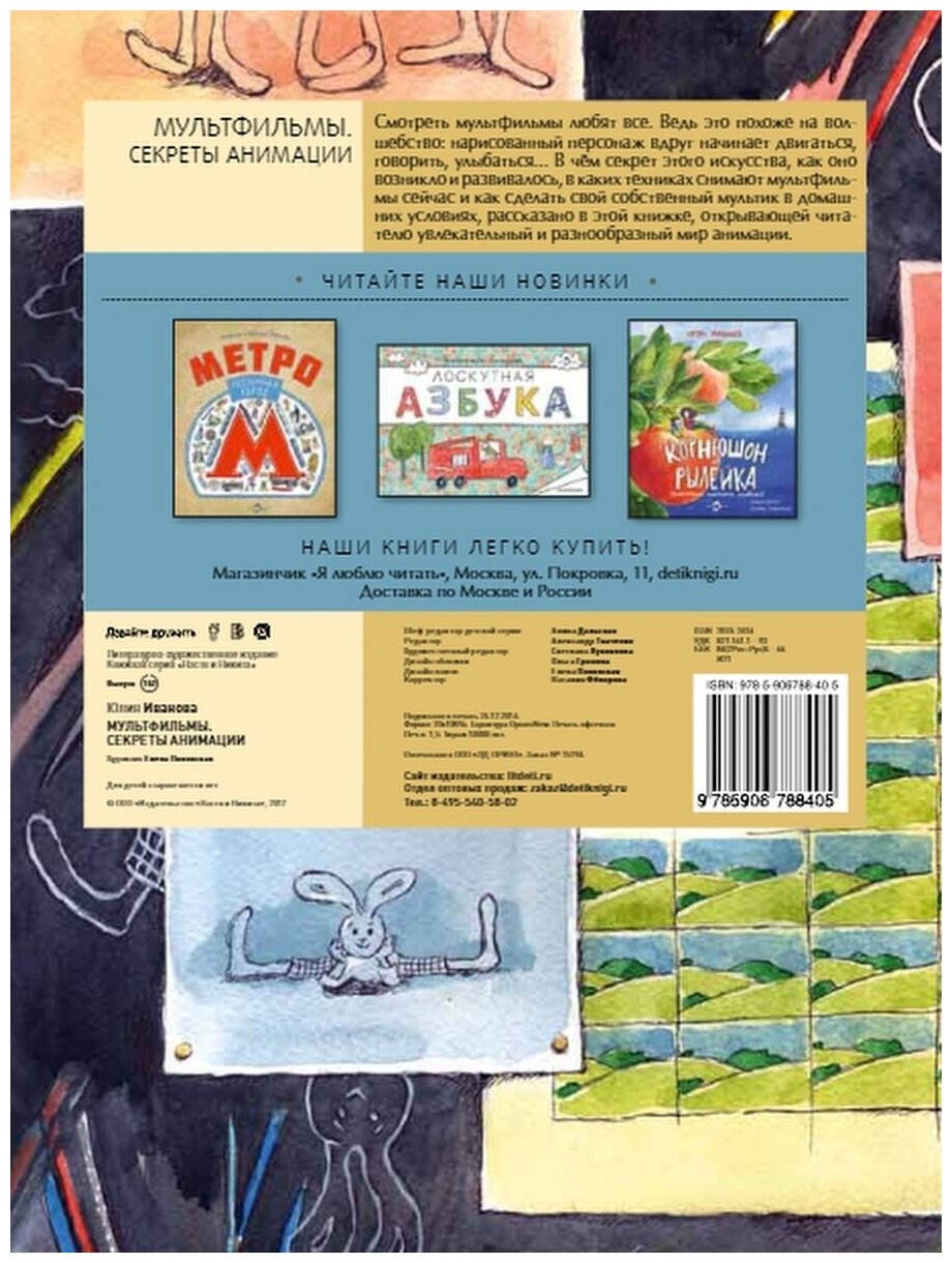 Смотреть мультфильмы любят все. Ведь это похоже на волшебство: нарисованный персонаж вдруг начинает двигаться, говорить, улыбаться… В чём секрет этого искусства, как оно возникло и развивалось, в каких техниках снимают мультфильмы сейчас и как сделать свой собственный мультик в домашних условиях, рассказано в этой книжке, открывающей читателю увлекательный и разнообразный мир анимации.