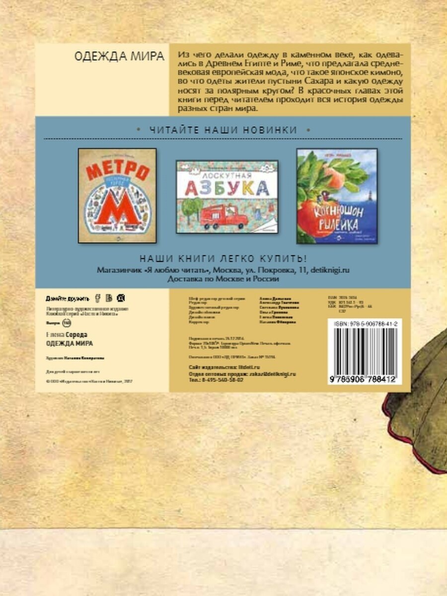 Купила книгу Елены Середы "Одежда мира" для работы, для ознакомления детей подготовительной группы по теме "Одежда". Книга очень интересная, познавательная. Дает представление о том, что носили первобытные люди. Знакомит с национальными костюмами разных стран мира. В этой книге можно узнать, как со сменой исторических эпох и культур менялась одежда. Можно получить информацию о том, из каких материалов и с помощью каких инструментов делали одежду. Книга будет полезна и интересна воспитателям, родителям, занимающимся с детьми дома, для детей начиная с 6 лет.