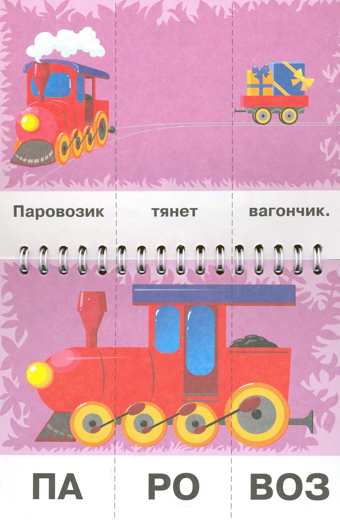 Книжечка компактного размера служит не только инструментом для обучения, но и для веселого времяпрепровождения! Поэтому ее всегда можно взять в дорогу, чтобы развлечь вашего малыша. Заранее разрежьте страницы книжечки по специальным линиям разреза, после чего каждую из трех частей страницы можно перевернуть. Переворачивайте каждую часть странички отдельно, чтобы получить веселые слова!