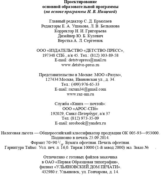 Проектирование основной образовательной программы (на основе программы Н.В. Нищевой) (Воронова И. В., Терехова Алла Николаевна, Русакова Д. А.); Детство-Пресс, 2016