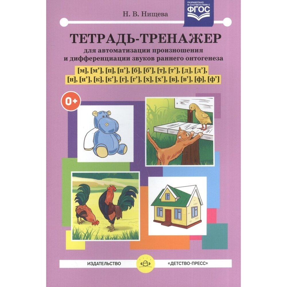Тетрадь-тренажер для автоматизации произношения и дифференциации звуков раннего онтогенеза [м] [м'] [п] [п'] [б] [б'] [т] [т'] [д] [д'] [н] [н'] [к] [к'] [г] [г'] [х] [х'] [в] [в'] (Нищева Наталия Валентиновна); Детство-Пресс, 2021