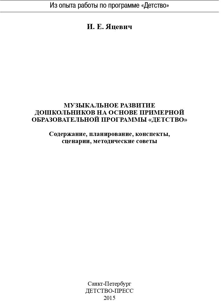 Музыкальное развитие дошкольников на основе примерной образовательной программы "Детство". Содержание планирование конспекты сценарии методические советы (Яцевич И. Е.); Детство-Пресс, 2018