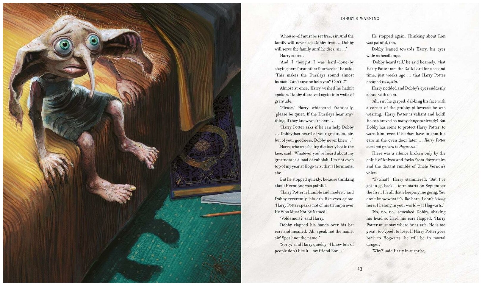 Award-winning artist Jim Kay illustrates year two of Harry Potters adventures at Hogwarts, in a stunning, gift-ready format. The Dursleys were so mean and hideous that summer that all Harry Potter wanted was to get back to the Hogwarts School for Witchcraft and Wizardry. But just as hes packing his bags, Harry receives a warning from a strange, impish creature named Dobby who says that if Harry Potter returns to Hogwarts, disaster will strike. And strike it does. For in Harrys second year at Hogwarts, fresh torments and horrors arise, including an outrageously stuck-up new professor, Gilderoy Lockhart, a spirit named Moaning Myrtle who haunts the girls bathroom, and the unwanted attentions of Ron Weasleys younger sister, Ginny. But each of these seem minor annoyances when the real trouble begins, and someone -- or something -- starts turning Hogwarts students to stone. Could it be Draco Malfoy, a more poisonous rival than ever? Could it possibly be Hagrid, whose mysterious past is finally told? Or could it be the one everyone at Hogwarts most suspects. Harry Potter himself? Отмеченный наградами художник Джим Кей иллюстрирует второй год приключений Гарри Поттера в Хогвартсе в потрясающем формате, готовом для подарков. В то лето Дурсли были такими подлыми и отвратительными, что Гарри Поттер хотел только вернуться в школу чародейства и волшебства Хогвартс. Но пока он пакует чемоданы, Гарри получает предупреждение от странного озорного существа по имени Добби, который говорит, что, если Гарри Поттер вернется в Хогвартс, случится катастрофа. На втором курсе Гарри в Хогвартсе возникают новые мучения и ужасы, в том числе возмутительно заносчивый новый профессор Гилдерой Локхарт, дух по имени Стонущая Миртл, который часто посещает ванную комнату для девочек, и нежелательное внимание младшей сестры Рона Уизли, Джинни. каждое из них кажется незначительным раздражением, когда начинаются настоящие проблемы, и кто-то - или что-то - начинает обращать студентов Хогвартса в камень. Может ли это быть Драко Малфой, более ядовитый соперник, чем когда-либо? Может быть, это Хагрид, чье загадочное прошлое наконец рассказано? Или это может быть тот, кого больше всего подозревают в Хогвартсе . сам Гарри Поттер?