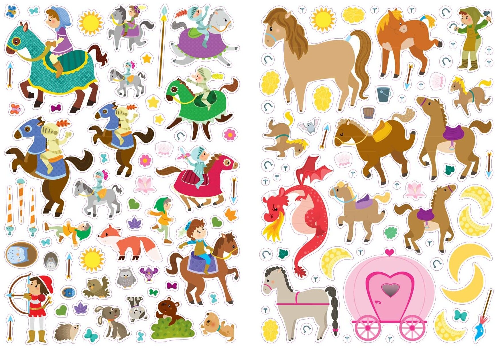 "Книга с наклейками. Принцессы и рыцари" - обучающие книги для детей от 3-х лет с вкладышами-наклейками внутри. Ваш малыш любит клеить наклейки, и ему нужен простор для воображения? Мы придумали книгу как раз для него! С помощью 600 разноцветных наклеек ребёнок сможет создать собственную картину дворцовой жизни, познакомиться с обитателями замка, весело и с пользой провести время.