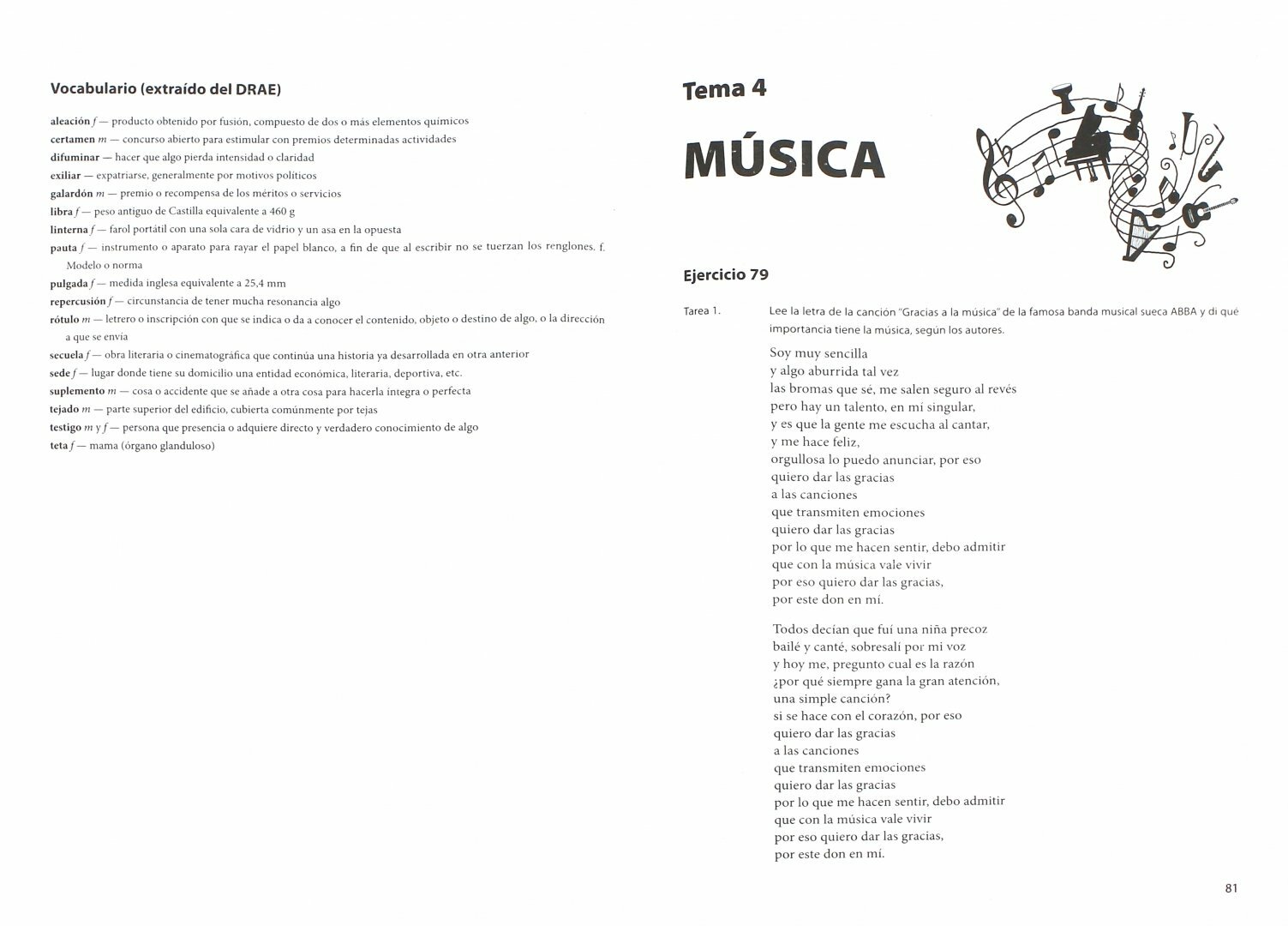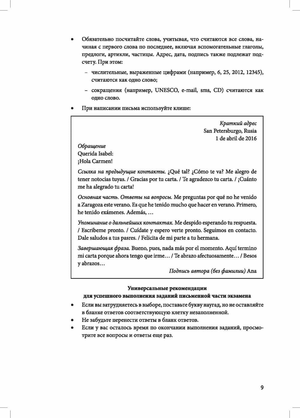 Пособие охватывает следующие темы, изучаемые в 9 классе: "Мода", "Кино", "Театр", "Музыка" и "Живопись". В книге приводятся аутентичные тексты и диалоги с заданиями по разным видам речевой деятельности: чтению и пониманию прочитанного, лексические, лексико-грамматические упражнения, упражнения по развитию навыков аудирования и говорения, написанию личного письма. Из более чем 150 заданий данного пособия около 100 соответствуют формату Единого государственного экзамена. В пособии также содержится раздел с методическими рекомендациями по выполнению различных видов заданий, а также словарь по каждой теме, объясняющий значение незнакомых слов на испанском языке в соответствии с нормами Королевской академии испанского языка RAE. Обширный песенный и познавательный материал, продуктивные творческие задания мотивируют учащихся к изучению испанского языка.