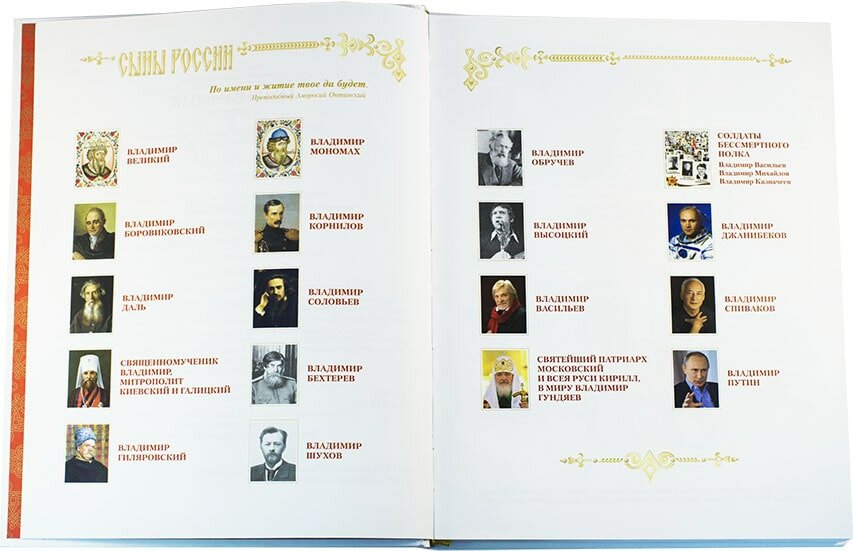 .Издание посвящено выдающимся людям, прославившим имя Владимир, от великого равноапостольного князя до Святейшего патриарха и президента России, через тысячелетия продолжившим дело святого князя.