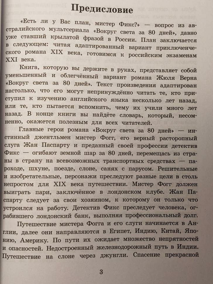 Первая прочитанная мной книга Жуля Верна. Сама по себе книжка интересная, но есть одно "НО". Книга больше ориентирована на пособие для учащихся. Помимо текста содержит в себе кучу заданий, которые ,в свою очередь, занимают немалый объем страниц, при том что сама по себе книга изначально мала. В связи с этим чтение сводится к нескольким часам. В книге есть словарь, также после каждой части есть сноски на перевод некоторых слов и фраз. В остальном все хорошо. В целом, книга оставила приятные впечатления. В будущем есть желание прочесть данное произведение уже на высоком уровне. Интересна будет как мальчикам так и девченкам. Здесь вас ждут приключения, детективная история, дружба, романтика и многое другое.