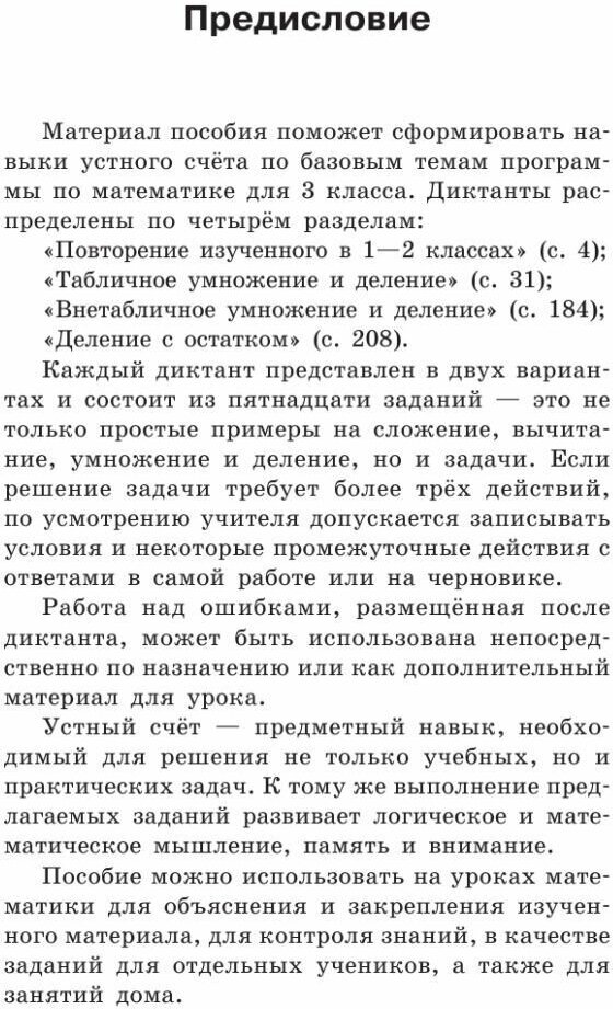 Каждый диктант представлен в двух вариантах и состоит из пятнадцати заданий - это не только простые примеры на сложение, вычитание, умножение и деление, но и задачи. Работа над ошибками, размещённая после диктанта, может быть использована непосредственно по назначению или как дополнительный материал для урока.