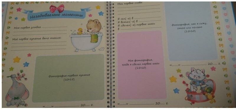 Заказала друзьям фотоальбом, как подарок на рождения моего сыночка, каких-либо предпочтений у меня не было, полностью доверилась на вкус своих друзей. Они нам подарили именно вот этот альбом. Понравилось то, что есть место как бы на предисторию: фотографии родителей, свадьбы и беременности, есть место для снимков УЗИ. Еще из плюсов есть месячная разбивка, где можно отмечать какие-то нюансы, рост и вес. Понравилось то, что есть картинка зубов, где можно отмечать время прорезывания. И вот я немного не согласна с автором другого отзыва, где он негативно отнеся к тому, что нет чистых листов для отпечатков ручки и ножки. Ну как бы, наверно, не пробовал прицельно попасть измазаной краской ручкой в нужное конкретное место: измазано будет все вокруг. Плюс не факт, что с первого раза получится красиво и четко.