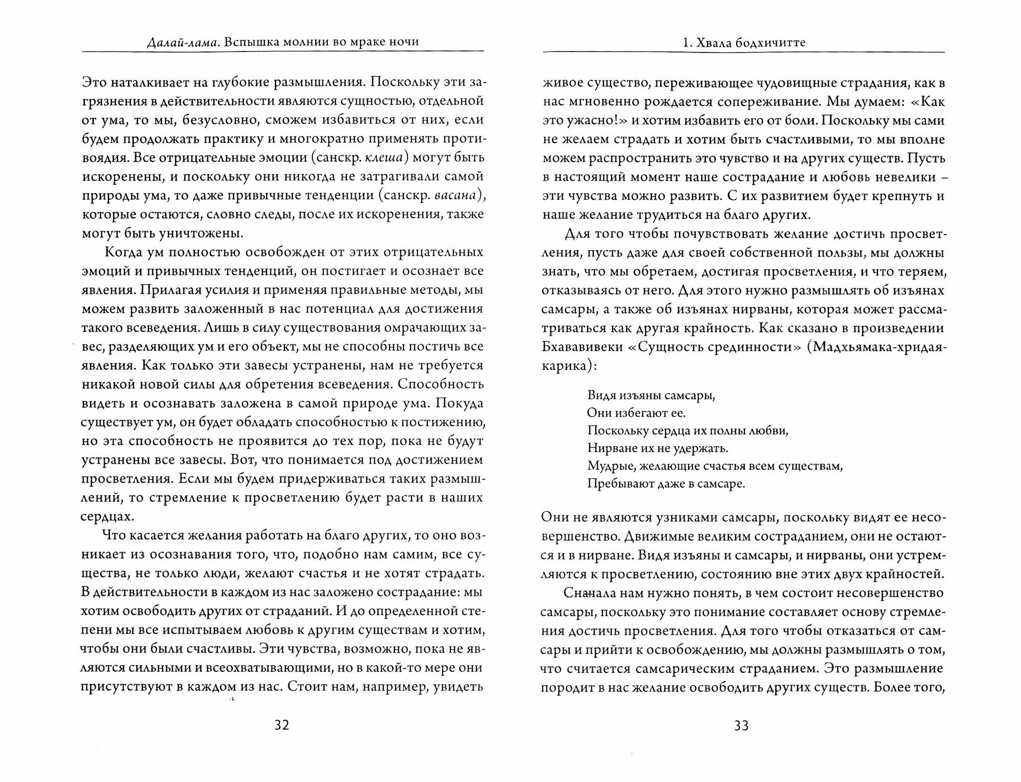 "Путь бодхисаттвы" ("Бодхичарья-аватара") - крупнейшее произведение буддизма махаяны, написанное выдающимся индийским мыслителем и поэтом VIII века Шантидевой. Его Святейшество Далай-лама XIV включил имя Шантидевы в число семнадцати пандит (ученых) древнеиндийского университета Наланда, внесших наиболее существенный вклад в развитие буддийской мысли. В книге "Вспышка молнии во мраке ночи" Далай-лама кратко комментирует наиболее важные строфы из десяти глав "Бодхичарья-аватары", разъясняя практику шести парамит (совершенств): щедрость, нравственность, терпение, усердие, медитацию и мудрость. Книга составлена на основе устных поучений Далай-ламы, дарованных в Дордони, во Франции, в августе 1991 года.