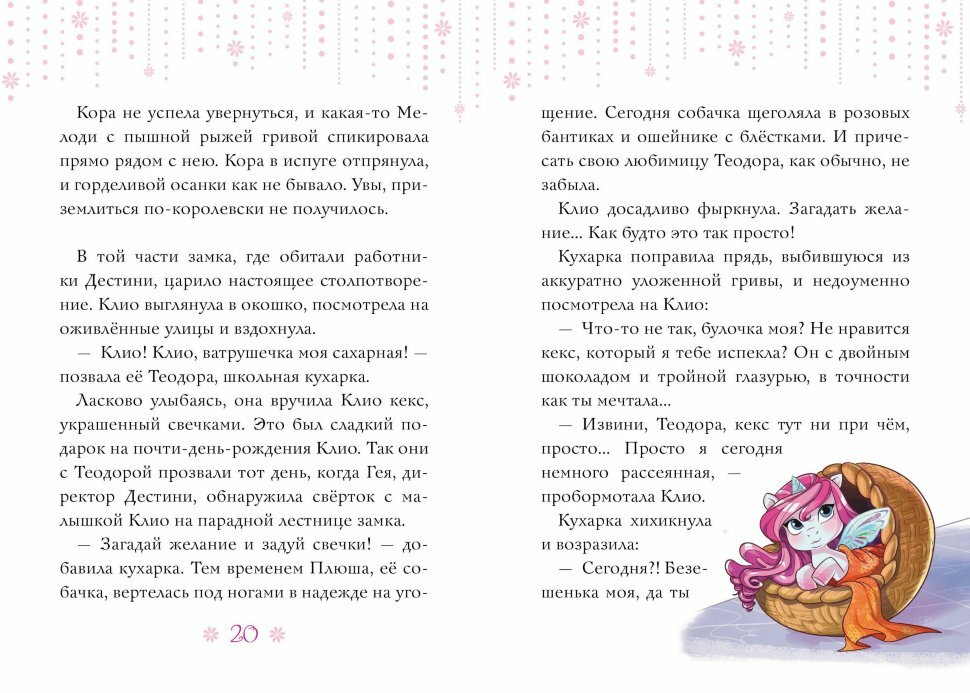 Далеко среди звёзд сияет золотистым светом планета Аура. Населяют эту планету крылатые кони, пегасы. Среди них есть Мелоди — девочки-пегасы, которые рождаются с удивительным символом на крыльях и наделены скрытой до поры до времени волшебной силой. В четырнадцать лет каждая Мелоди отправляется в легендарную школу Дестини, парящую среди облаков. Там девочки-пегасы учатся пользоваться волшебной силой и постигают своё предназначение… Клио выросла в замке Дестини. Начало учебного года приходится прямёхонько на её день рождения — точнее, на почти-день-рождения. Настоящего дня рождения Клио никто не знает — ведь она подкидыш, которого однажды нашли на ступенях школы. А сегодня Клио как раз исполняется четырнадцать, только стать первоклассницей ей не суждено — нет у неё на крыльях никакого символа, она самая обычная девочка-пегас, а вовсе не Мелоди. Поэтому ей остаётся лишь с грустью наблюдать за новенькими ученицами, столпившимися перед парадной лестницей… И Клио даже не догадывается, что иногда сбываются самые несбыточные мечты!