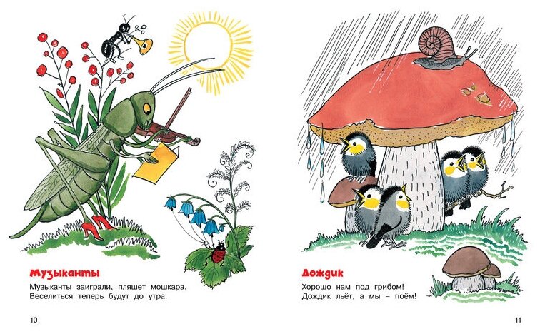 Отличная книга для самых маленьких. Детям дошкольного возраста, любящим истории в картинкам Владимира Сутеева, эта книга тоже понравится. В начале книги идут стихи из двух строк, в конце книги уже стихи из пяти шести четверостиший. Во всех стихотворениях, а из более 80, каждые две-четыре строки сопровождаются сюжетными рисунками самого автора. Красочные рисунки с большим количеством деталей интересно рассматривать ребенку, находить и узнавать что-то новое для себя, дополнительно описывать, тем самым развивать речь. В первый день мой ребенок несколько раз брал книгу и просил почитать, и в дальнейшем интерес к ней пропадал долгое время.