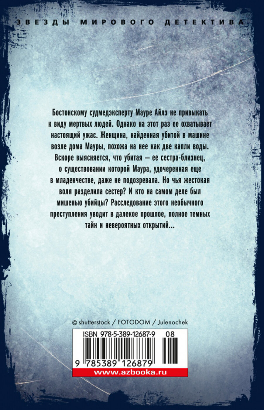 Бостонскому судмедэксперту Мауре Айлз не привыкать к виду мертвых людей. Однако на этот раз ее охватывает настоящий ужас. Женщина, найденная убитой в машине возле дома Мауры, похожа на нее как две капли воды. Вскоре выясняется, что убитая — ее сестра-близнец, о существовании которой Маура, усыновленная еще в младенчестве, даже не подозревала. Но чья жестокая воля разделила сестер? И кто на самом деле был мишенью убийцы? Расследование этого необычного преступления уводит в далекое прошлое, полное темных тайн и невероятных открытий...