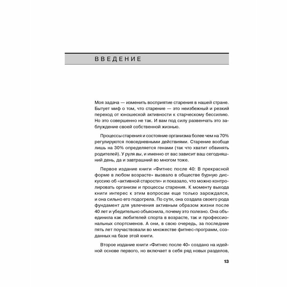 «Книга "Фитнес после 40" — не только о физических упражнениях. В ней представлены результаты многолетних исследований, которые показывают разницу между двумя подходами: сдаться старости или сделать так, чтобы следующие 40 лет стали лучшими в вашей жизни...» (Вонда Райт, Рут Винтер). Авторы книги рассказывают, как оставаться в прекрасной физической форме после 40, 50, 60 лет и даже в более зрелом возрасте. Вонда Райт и Рут Винтер знакомят нас с 6-недельной программой повышения активности «в следующие 40». «Фитнес после 40» — настоящий кладезь полезных знаний и советов тем, кто стремится поддерживать себя в форме: с чего начать, какую выбрать экипировку, с какой интенсивностью тренироваться и где, какие важные мелочи предусмотреть, как не травмировать себя по неопытности, как заниматься, если есть проблемы со здоровьем, как правильно ухаживать за своим телом, быть в хорошем настроении и вести активный образ жизни круглый год. Это настоящее руководство к действию для всех, кто достиг 40-летнего рубежа, но не передумал оставаться в отличной физической форме или решил ее обрести. Огромный опыт одного из авторов (д-ра Райт) в области тренировок и наблюдения возрастных профессиональных спортсменов помог создать четкое и нескучное пособие для этих целей.
