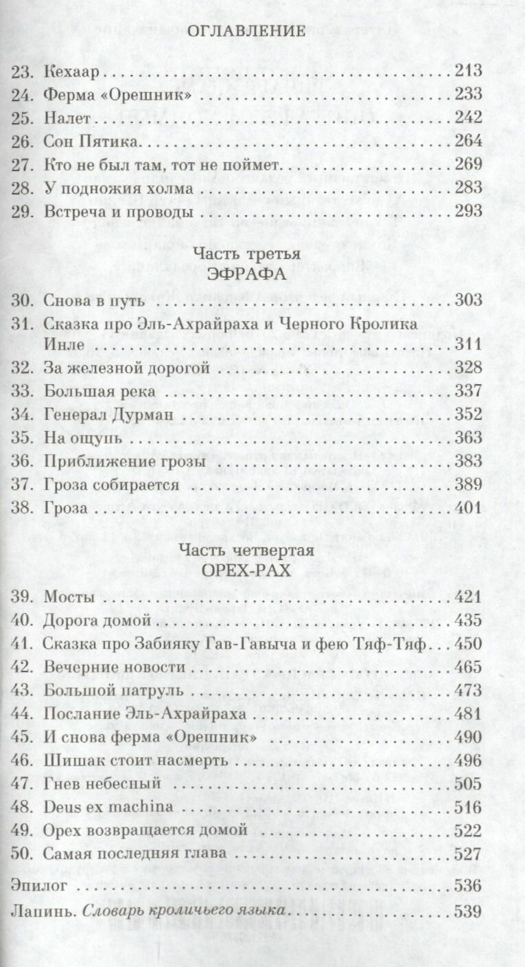 Потрясающая волшебная сказка. Будет невероятно интересна как детям, так и взрослым. каждый сможет найти поучительную мораль для себя. А возможно и узнать себя в ком-то из героев. Смелое и невероятное путешествие отважных кроликов в поисках нового дома. История о дружбе и вере. Вере в будущее и вере в себя. Вере в своего ближнего. О взаимопомощи и правде. О честности и смелости. История, которая покоряет с первых глав. Очень увлекательная и такая добрая сказка о необычном для нас, людей, мире диких кроликов, у которых есть свой особый язык, свои ритуалы и своя жизнь. И среди кроликов тоже есть свой Крепкий Орешек.