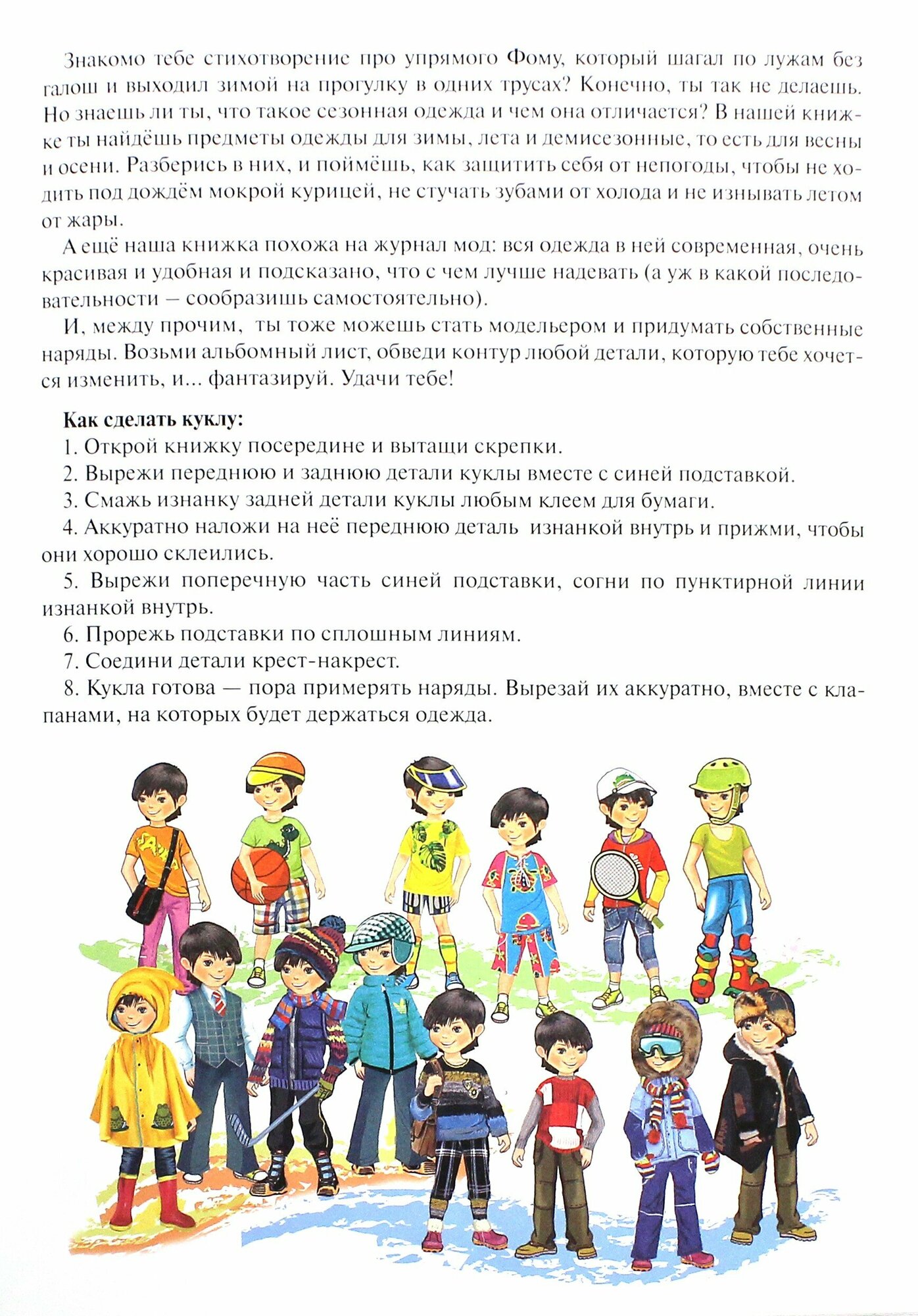 Книга "Знакомимся с сезонной одеждой. Оденься по погоде. Мальчики" предлагает вырезать бумажную куколку мальчика и различные варианты нарядов на все времена года и виды погоды для переодевания. Куколка мальчика вырезается из картонной обложки и склеивается из двух слоёв, поэтому она плотная. Куколка ставится на картонную подставку, что делает переодевание более лёгким, а готовый образ более репрезентативным. Одежда из более тонкой бумаги, чтобы облегчить процесс вырезания. Книга может использоваться как пособие для знакомства с различными видами одежды и правилами её выбора в зависимости от погоды. А может использоваться просто для игры.