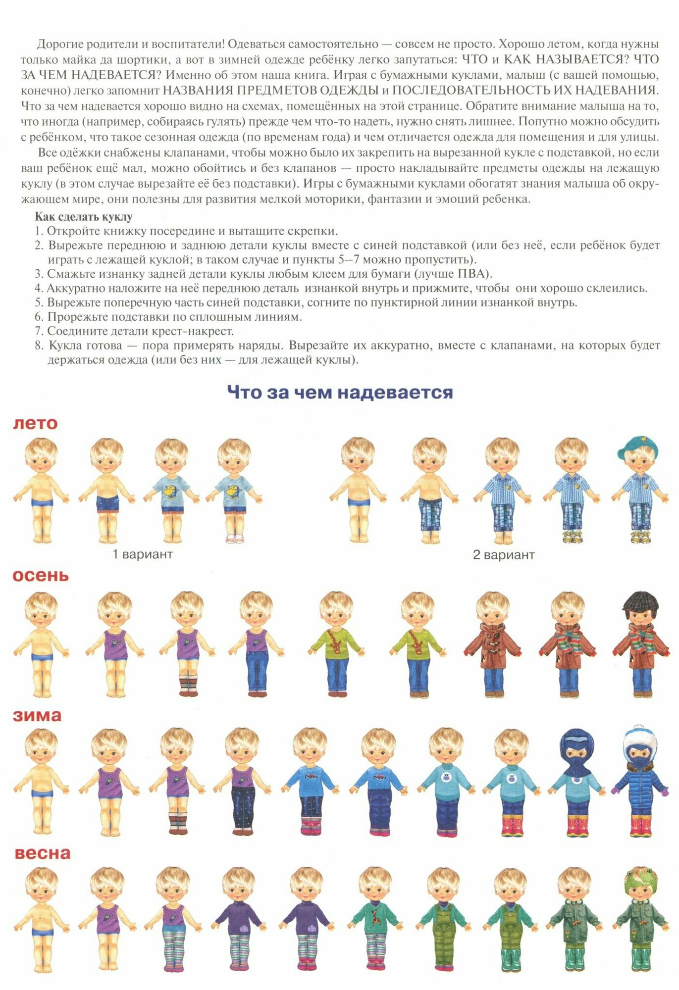 Книжка нам с дочкой очень понравилась! Бумажная кукла большого размера. После склеивания получается достаточно твёрдая. Особенно мне понравилось то, что в книге представлена одежда на все 4 времени года. В книге есть инструкция - последовательность одевания куклы на улицу и в помещении. Когда мы одели мальчика на улицу зимой, вся одежда на нем держалась, у нас фигурка лежала на столе. Играть в фигурку с таким количеством одежды не получиться.